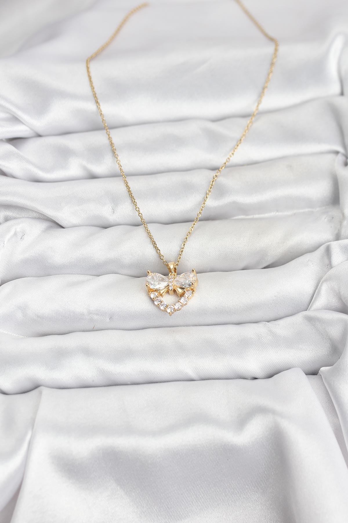 316L Çelik Zincir Gold Renk Kalp ve Fiyonk Model Zirkon Taşlı Kadın Kolye