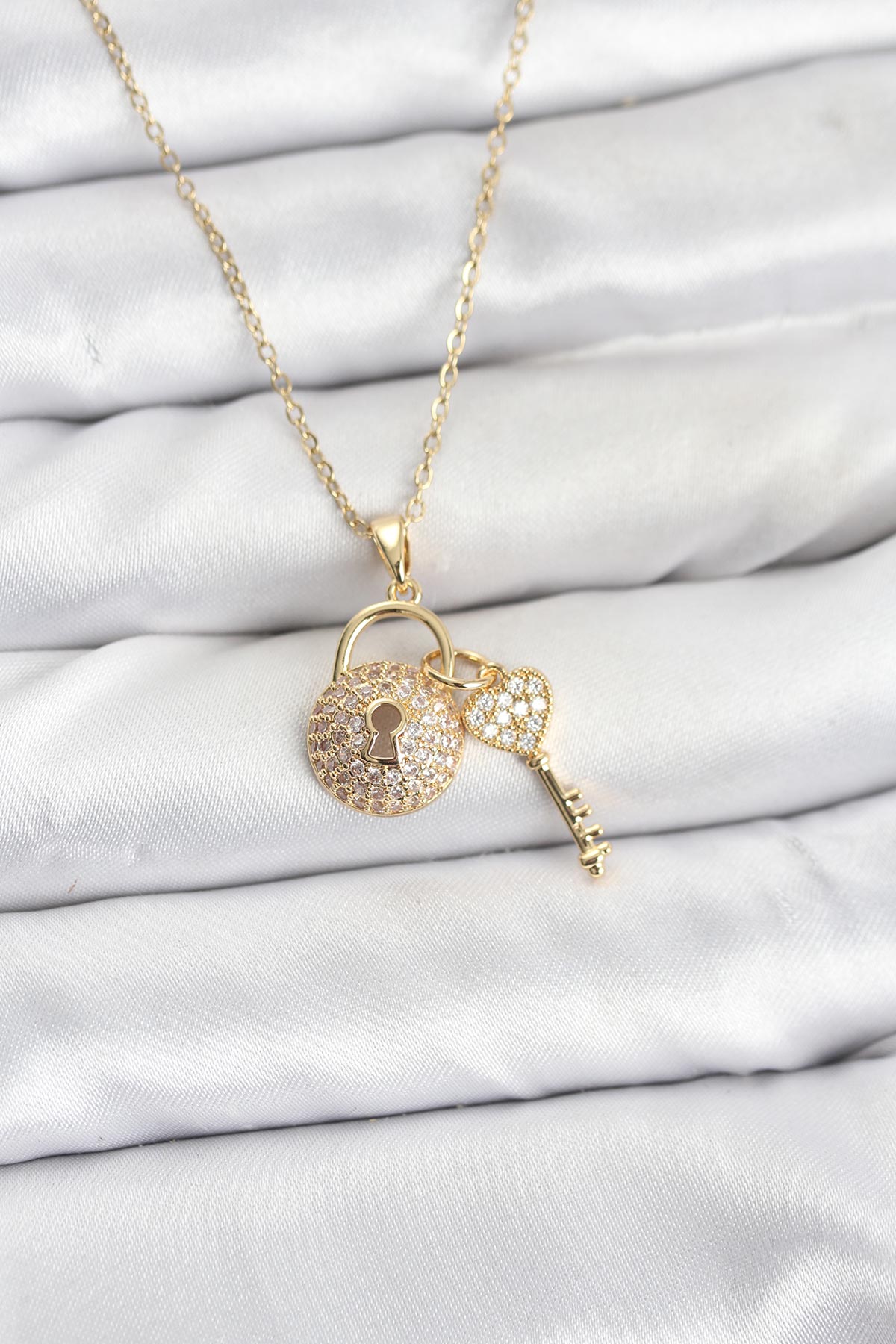 316L Çelik Zincir Gold Renk Kilit Anahtar Model Zirkon Taşlı Kadın Kolye