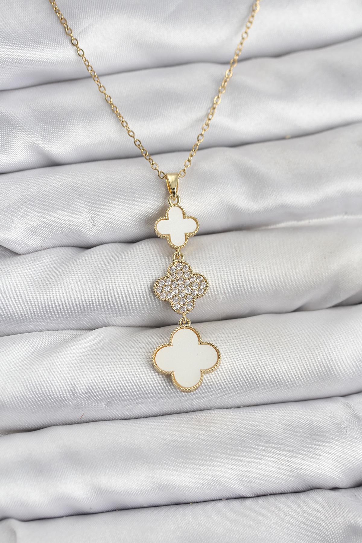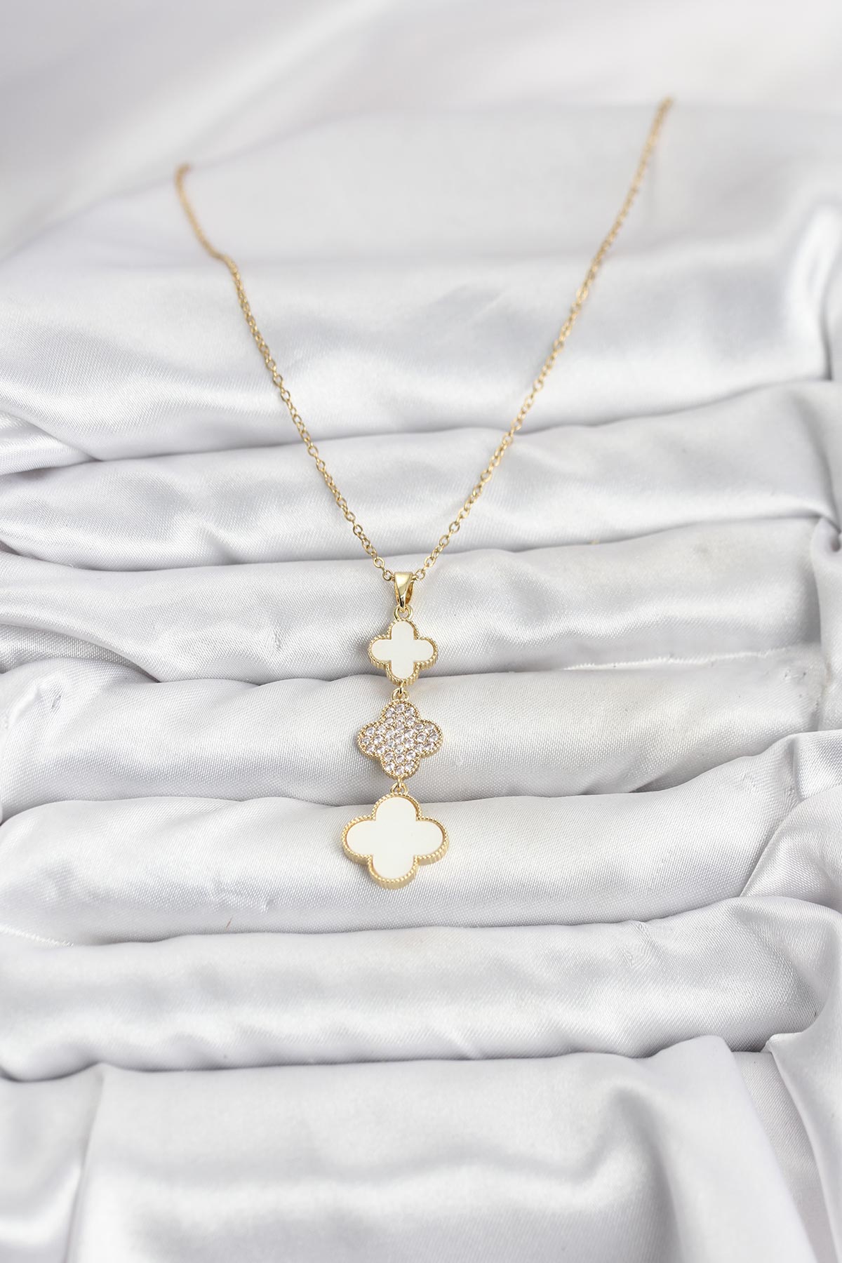 316L Çelik Zincir Gold Renk Yonca Detaylı Zirkon Taşlı Kadın Kolye