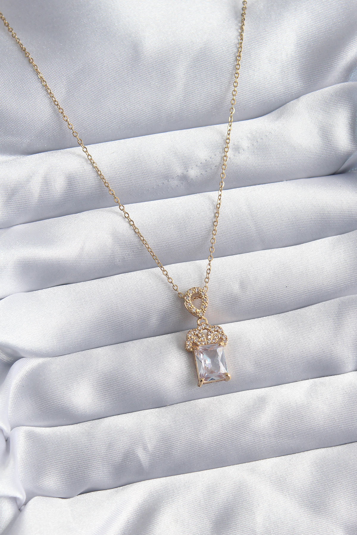 316L Çelik Zincir Gold Renk Zirkon Taşlı Taç Model Kadın Kolye