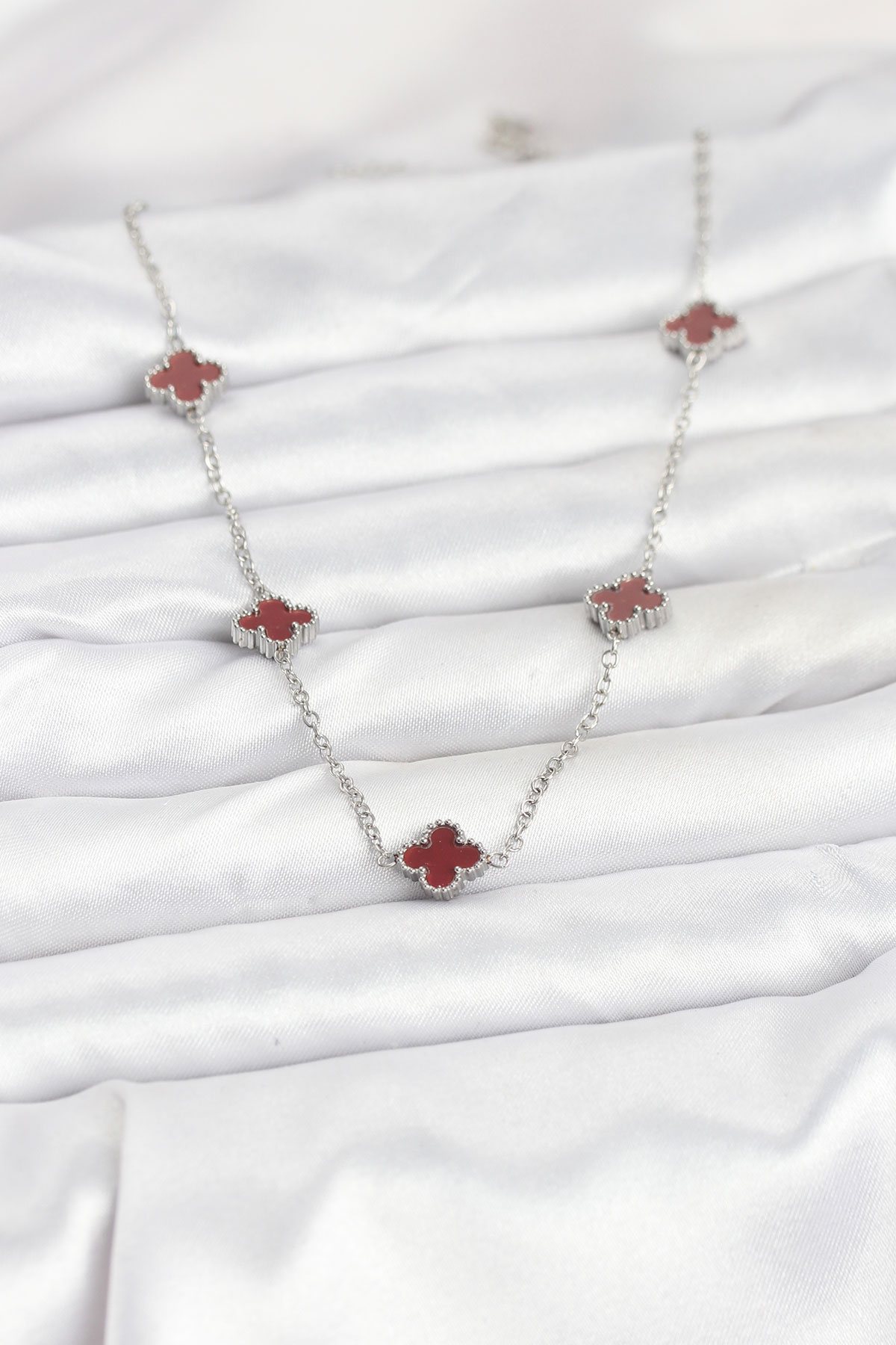 316L Çelik Zincir Gümüş Renk Bordo Baby Boy Yonca Kadın Kolye