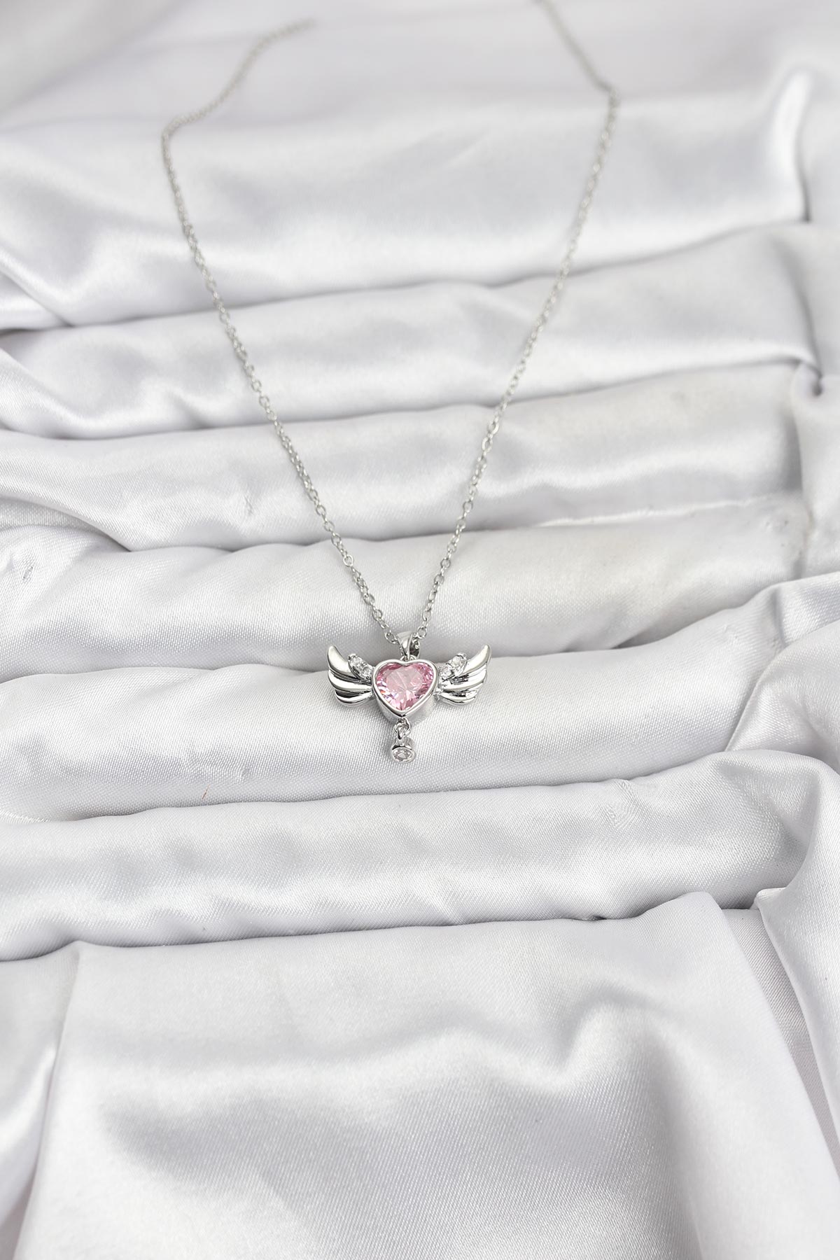 316L Çelik Zincir Gümüş Renk Kanatlı Kalp Model Zirkon Taşlı Kadın Kolye