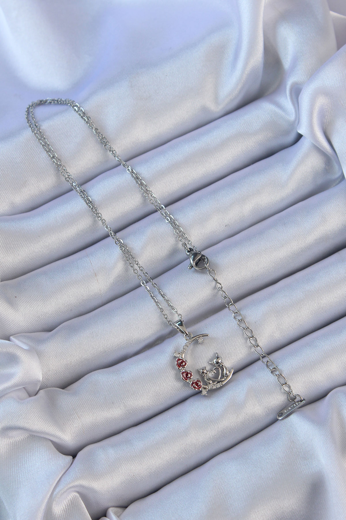 316L Çelik Zincir Gümüş Renk Kırmızı Gül Detay Kedi Figür Zirkon Taşlı Ay Kolye