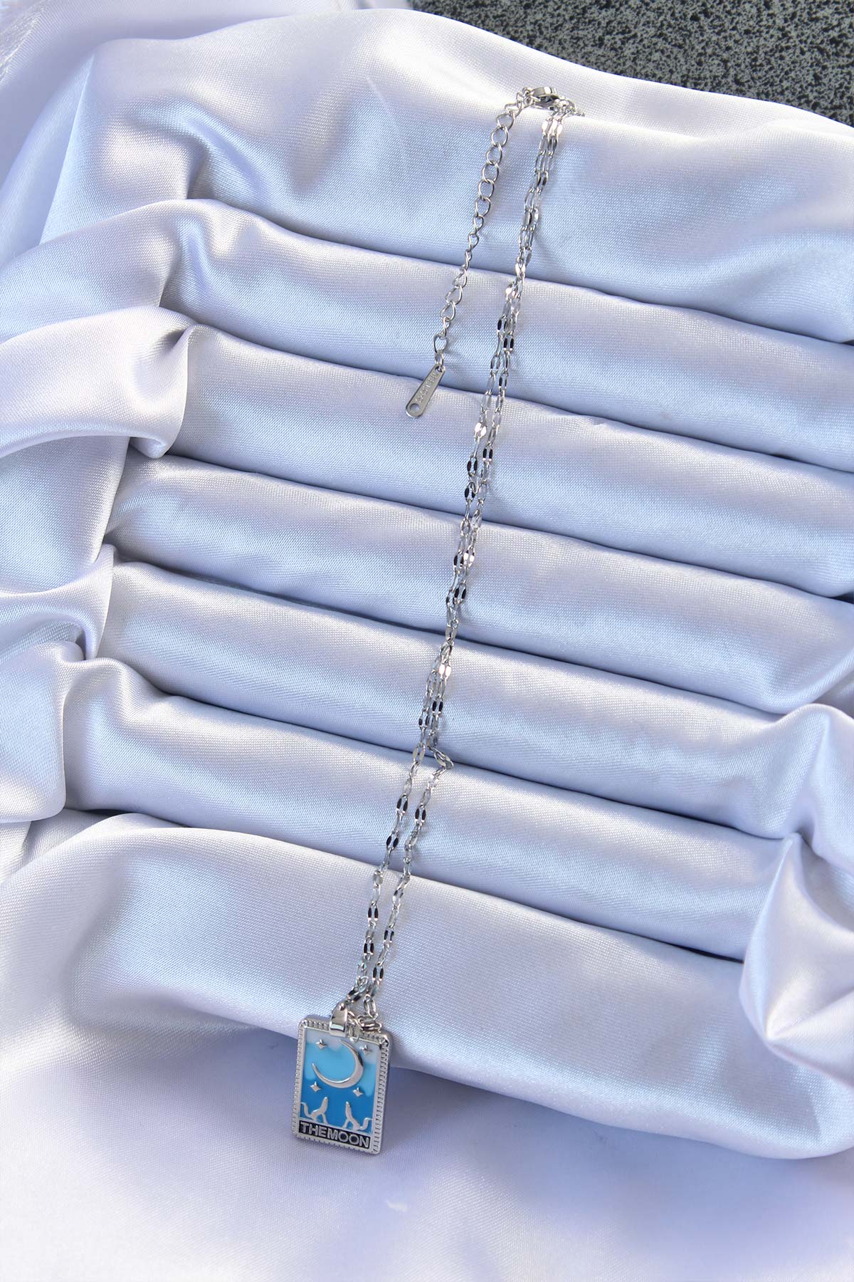 316L Çelik Zincir Gümüş Renk Mavi Mineli Ay Figür Tarot Kolye