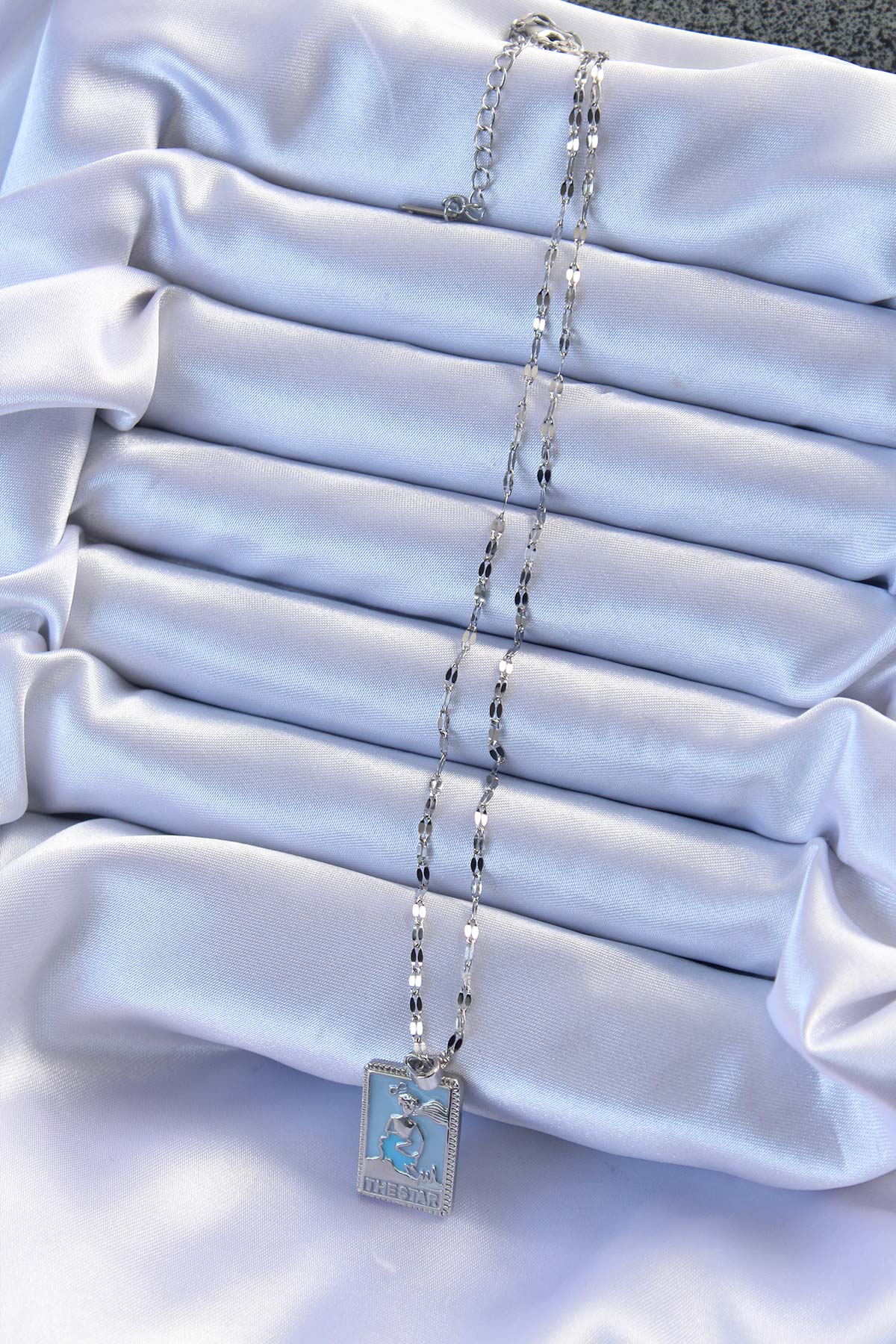 316L Çelik Zincir Gümüş Renk Mavi Mineli Tarot Kolye