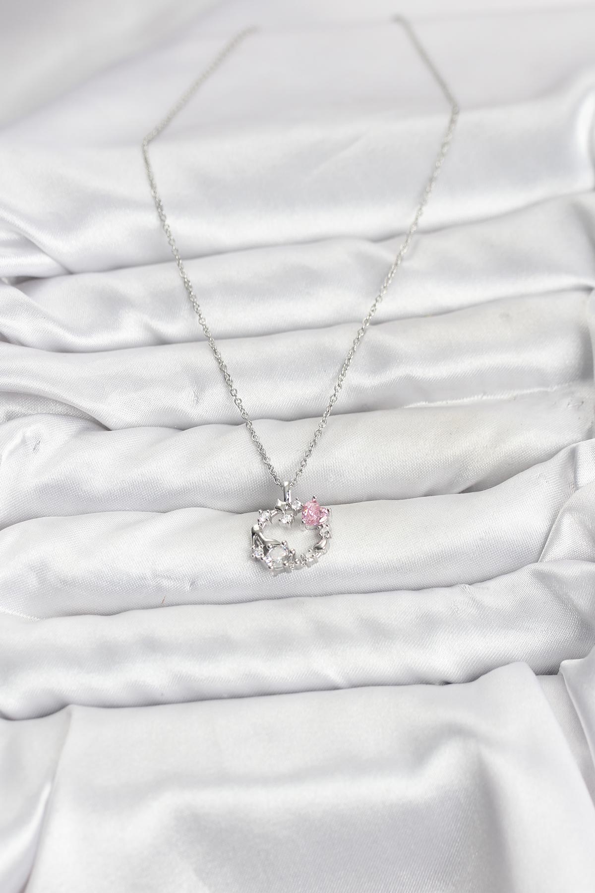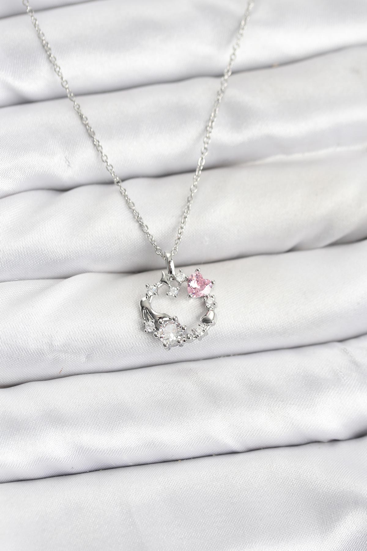 316L Çelik Zincir Gümüş Renk Pembe Taş Detaylı Çelenk Model Kadın Kolye