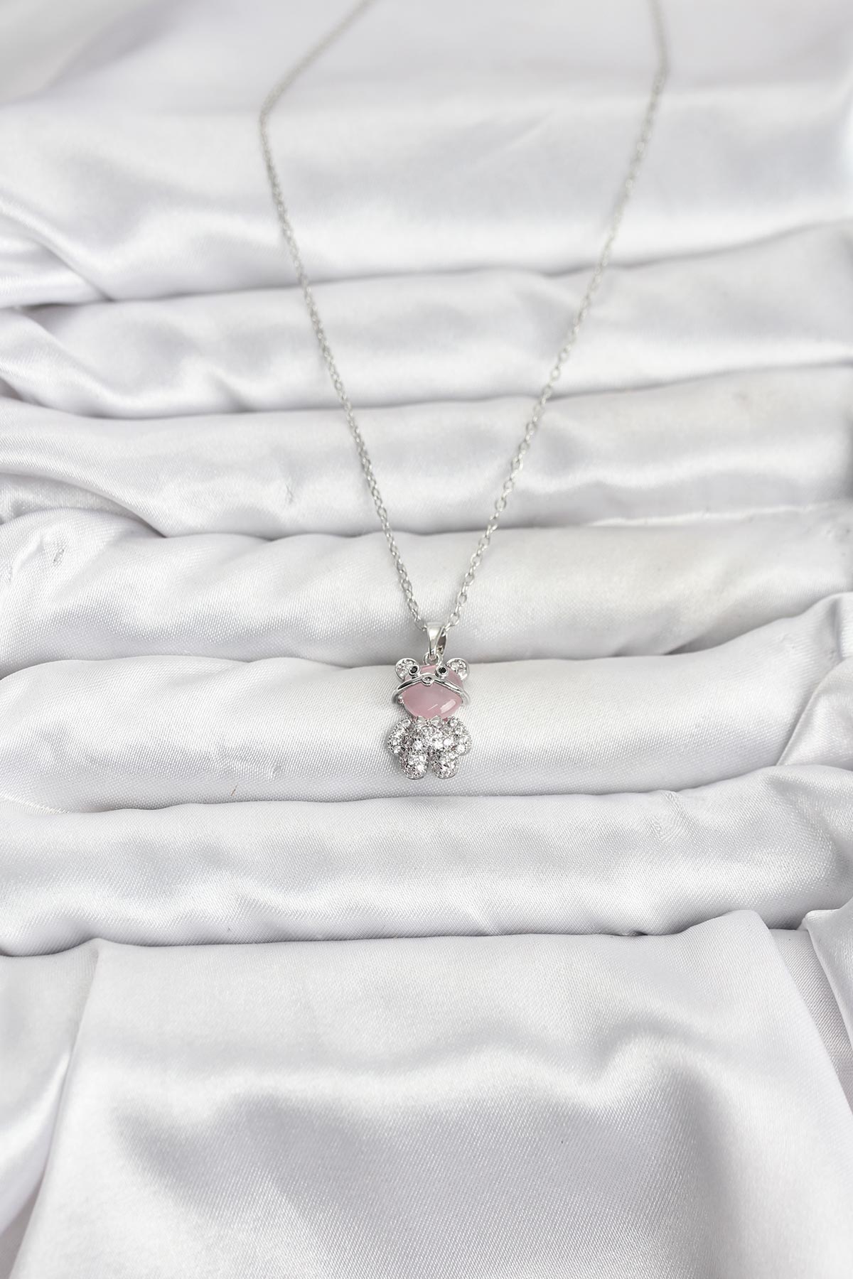 316L Çelik Zincir Gümüş Renk Teddy Bear Model Zirkon Taşlı Kadın Kolye