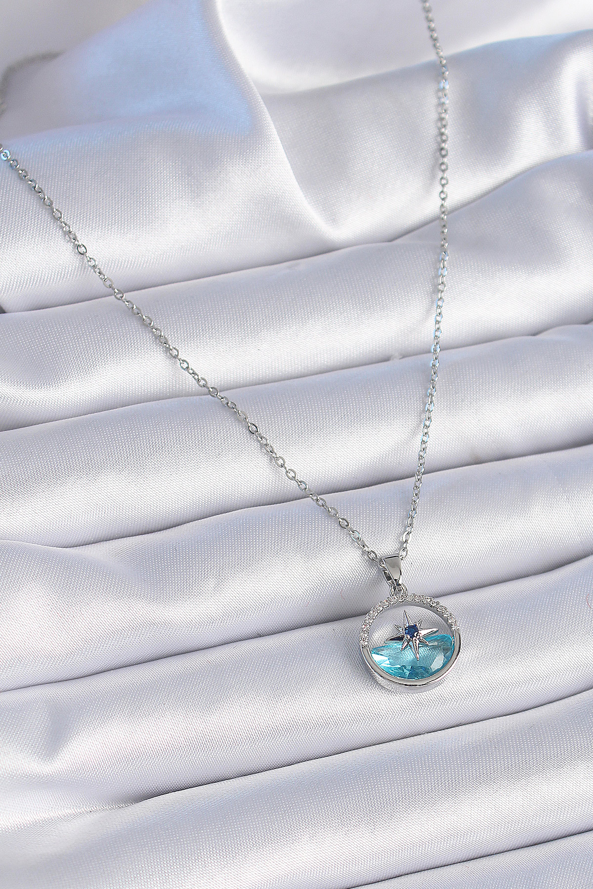 316L Çelik Zincir Gümüş Renk Zirkon Taşlı Deniz Görünüm Kutup Yıldızı Kolye