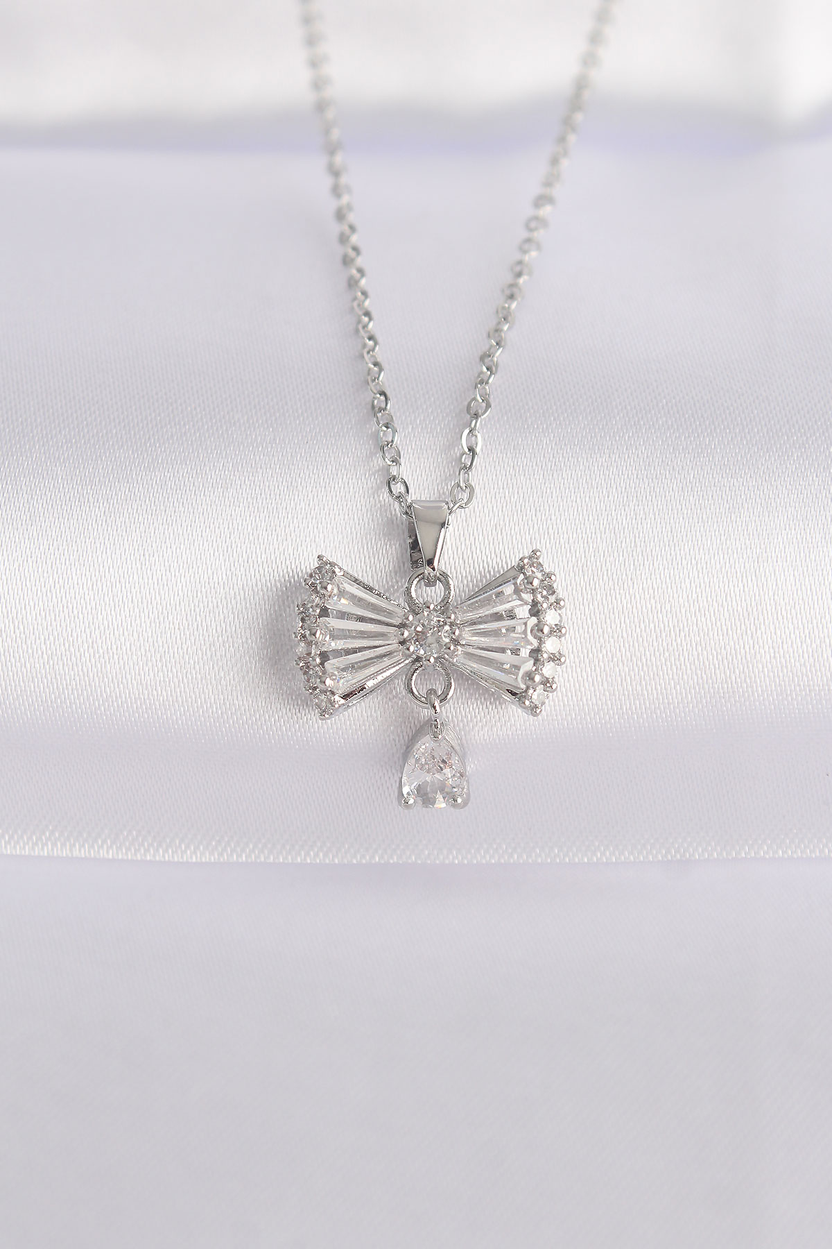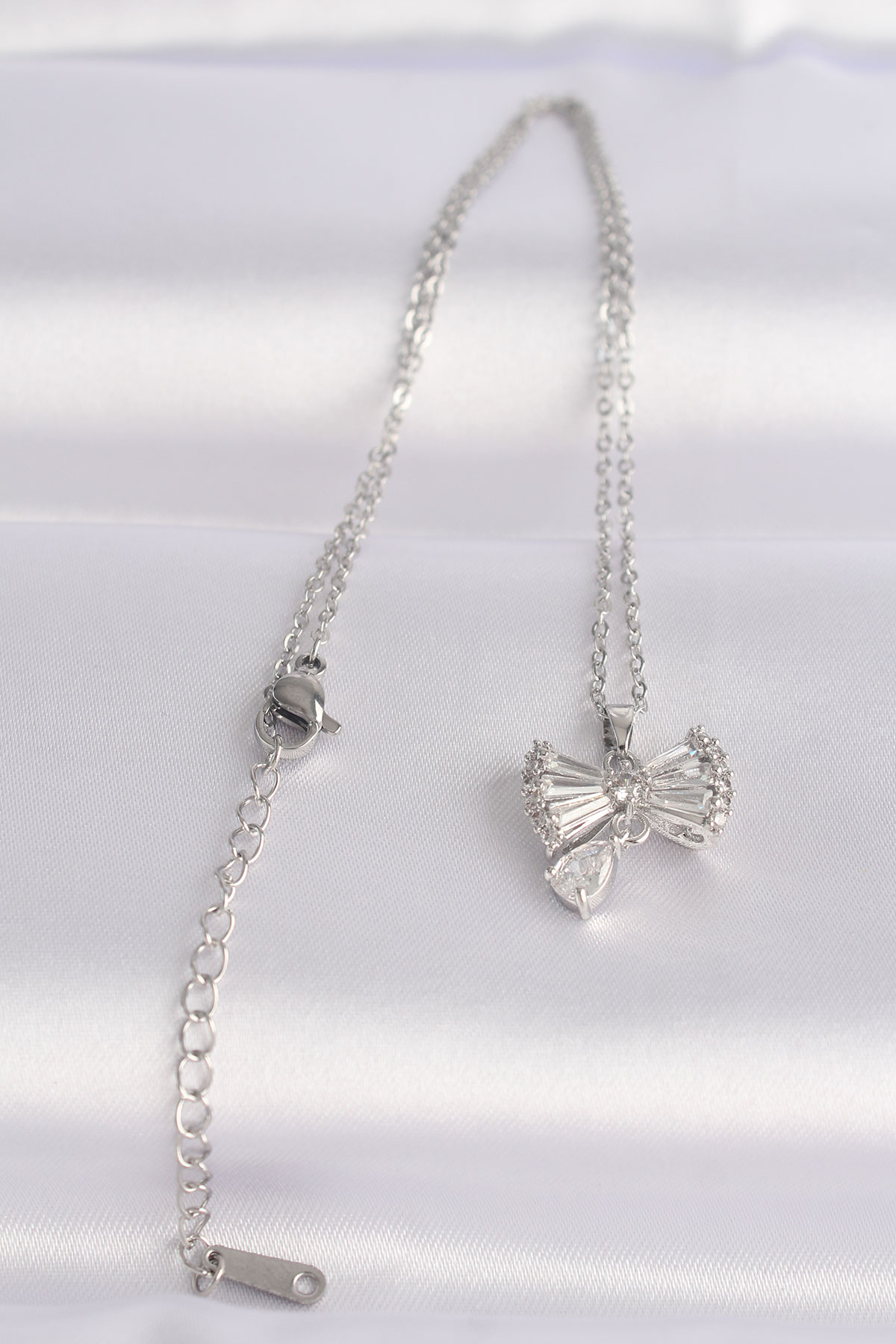 316L Çelik Zincir Gümüş Renk Zirkon Taşlı Kalp Detay Fiyonk Kolye
