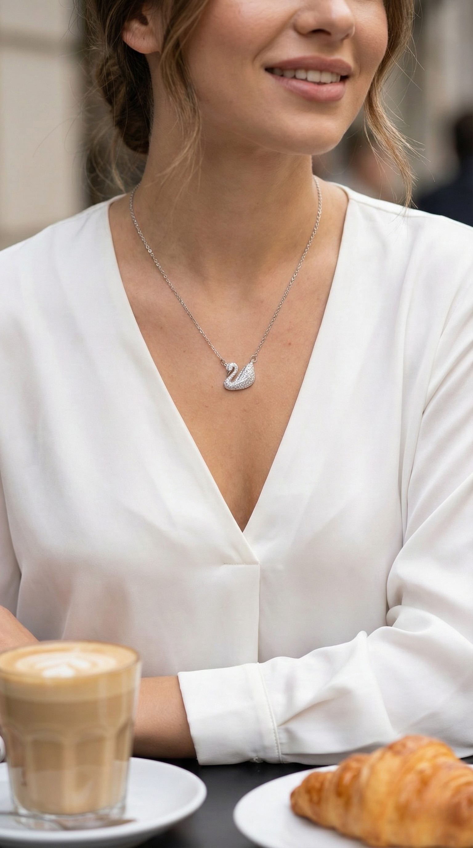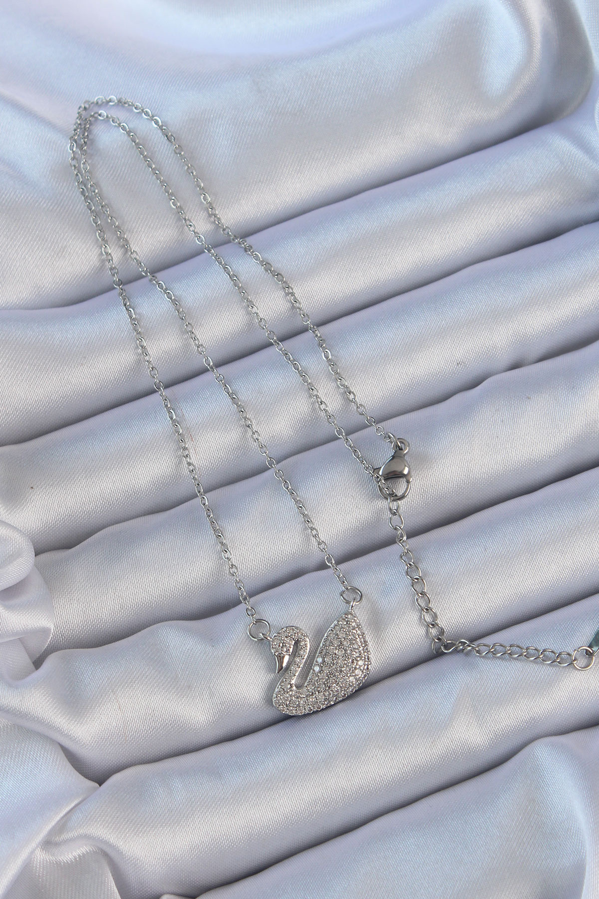 316L Çelik Zincir Gümüş Renk Zirkon Taşlı Kuğu Kolye