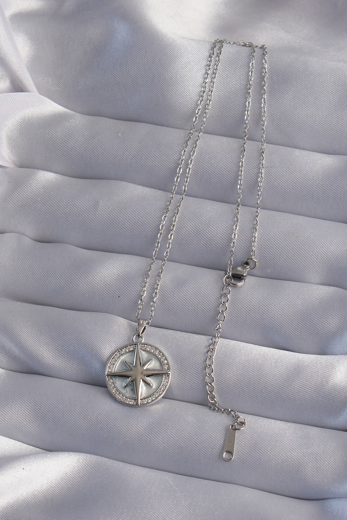 316L Çelik Zincir Gümüş Renk Zirkon Taşlı Kutup Yıldızı Kolye