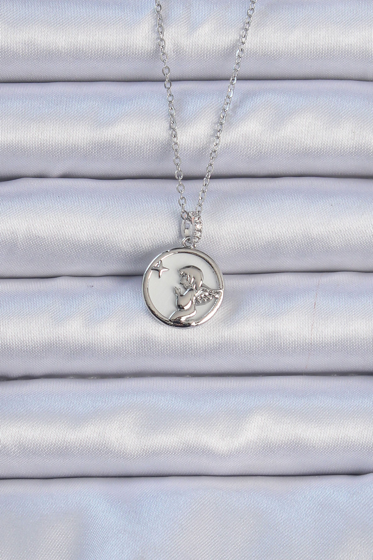 316L Çelik Zincir Gümüş Renk Zirkon Taşlı Mineli Melek Kolye