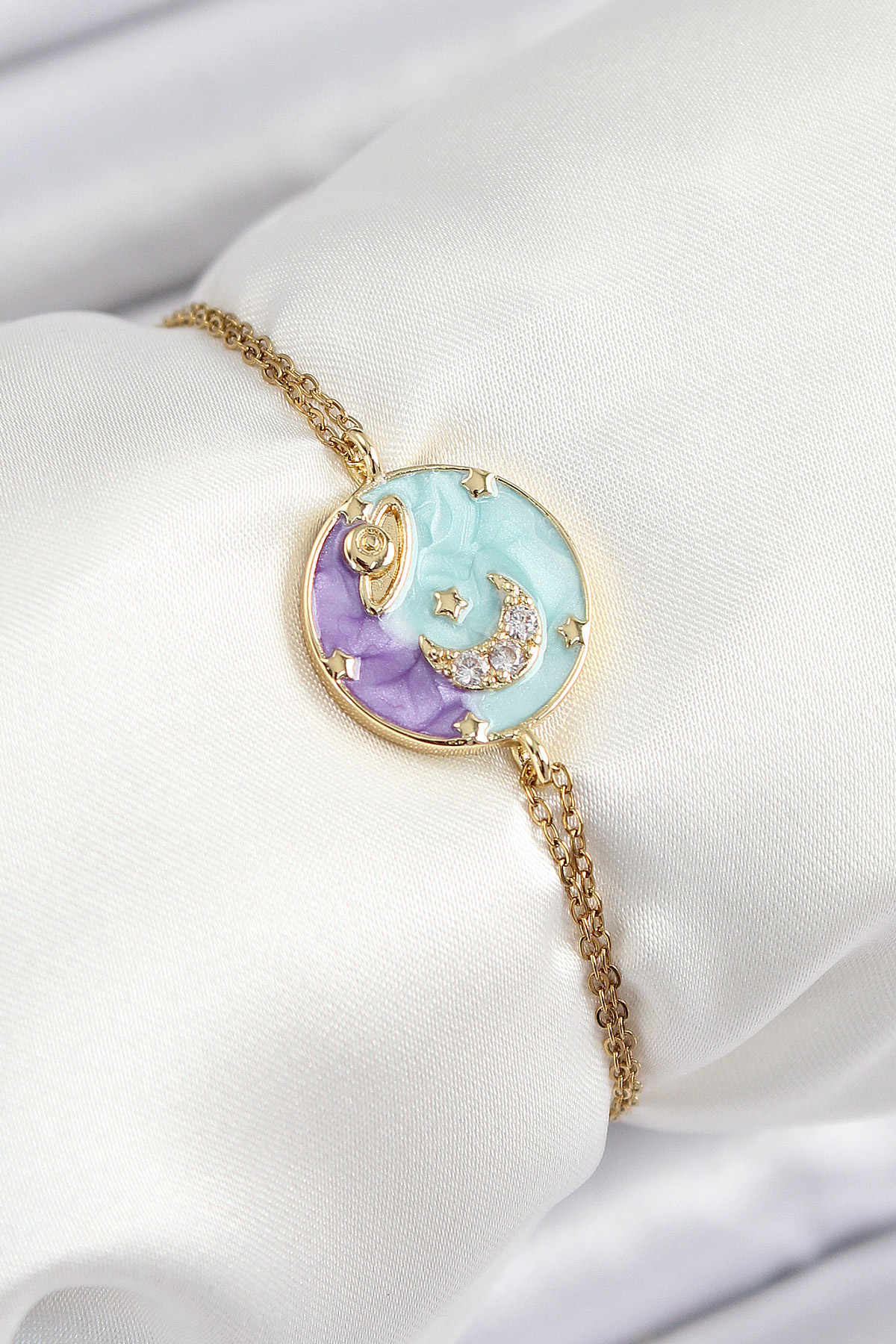 316L Çelik Zincir Mineli Sanatsal Portre Zirkon Taşlı Gezegen Model Gold Renk Kadın Bileklik