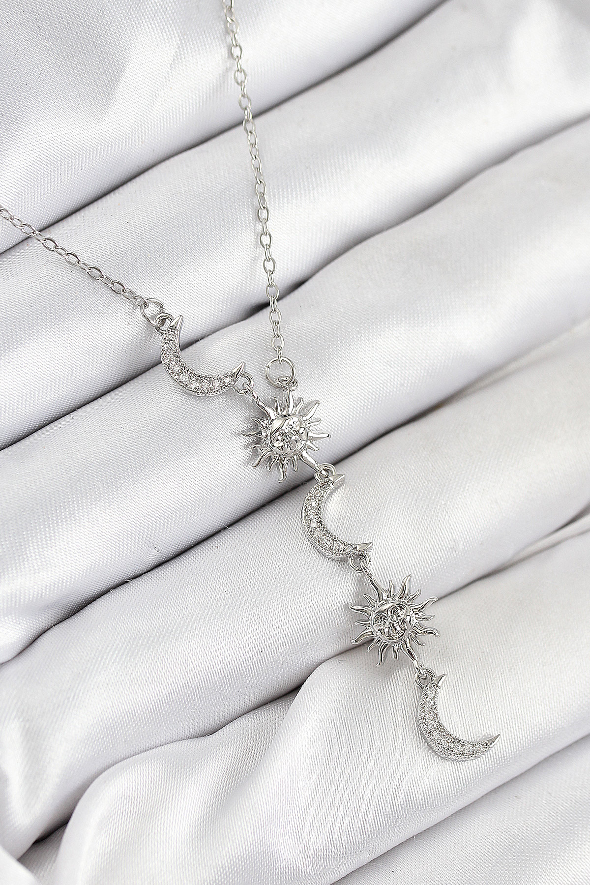 316L Çelik Zirkon Taşlı Güneş Ve Ay Model Gümüş Renk Kadın Kolye