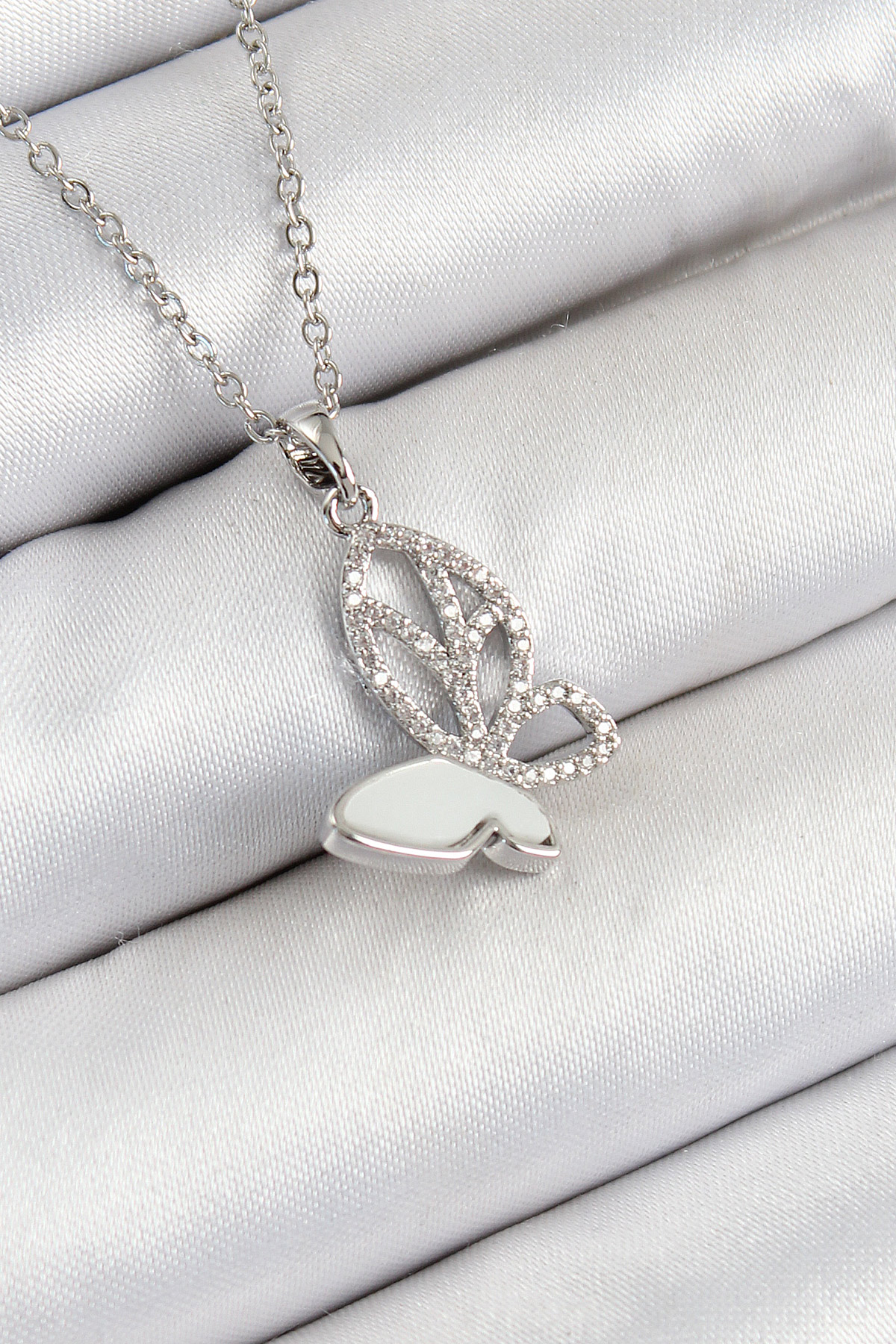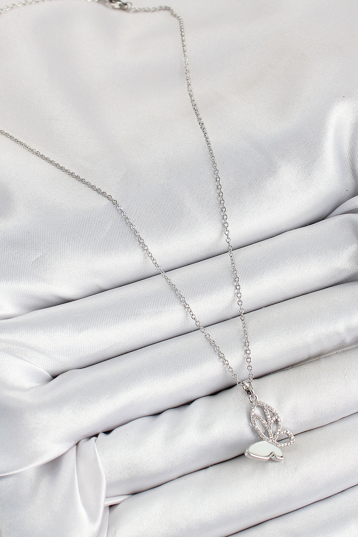 316L Çelik Zirkon Taşlı Kelebek Model Gümüş Renk Kadın Kolye