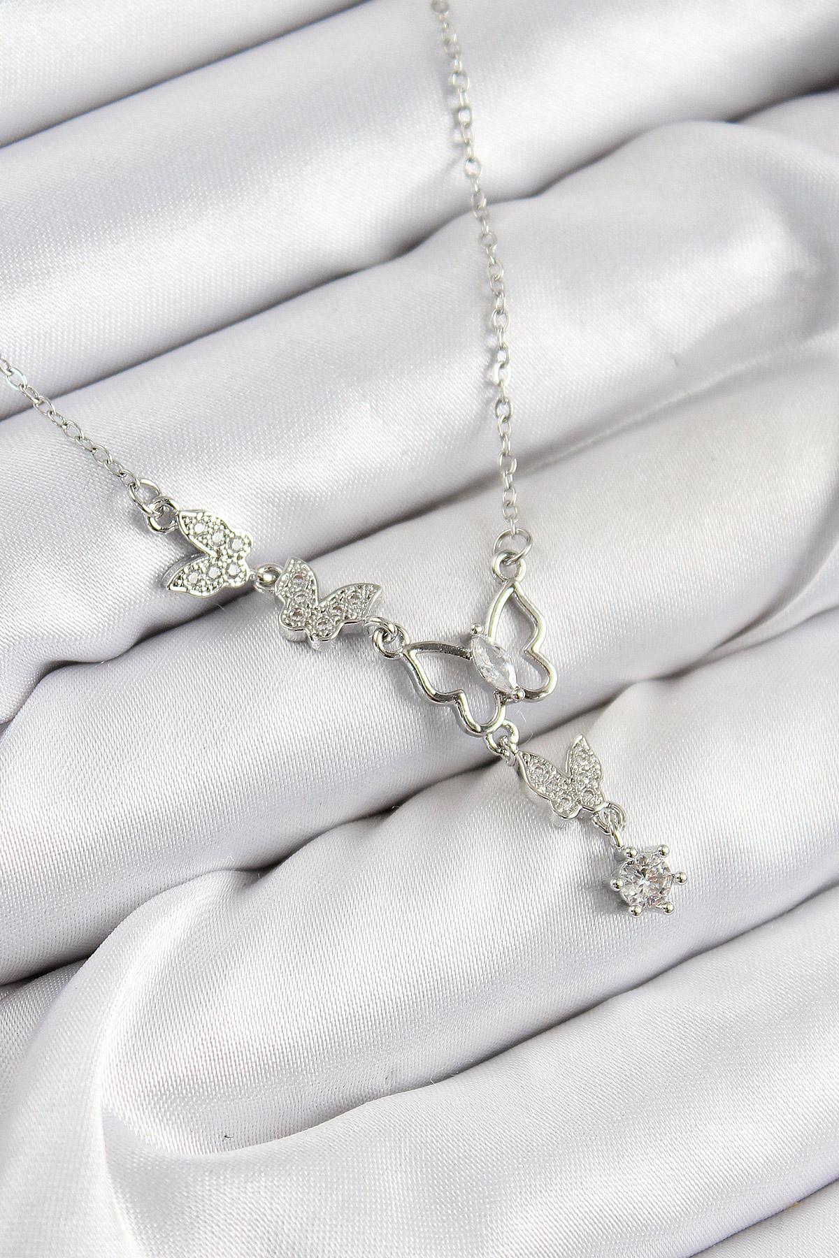 316L Çelik Zirkon Taşlı Kelebek Model Gümüş Renk Kadın Kolye