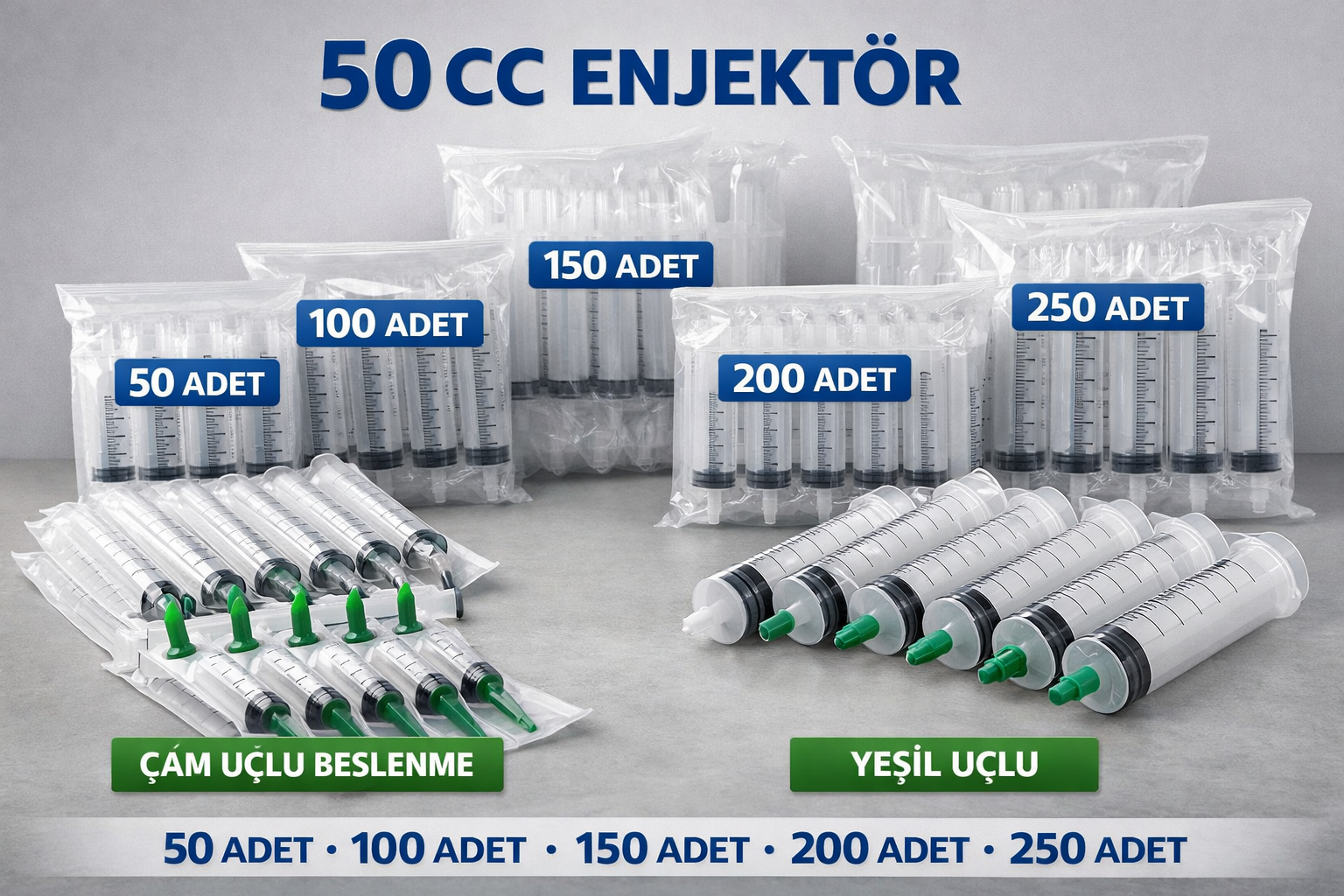50 cc enjektör, 50 ml enjektör, büyük hacimli enjektör, çam uçlu beslenme enjektörü, yeşil uçlu enjektör, 50 adet enjektör, 100 adet enjektör, 150 adet enjektör, 200 adet enjektör, 250 adet enjektör, medikal enjektör, veteriner enjektörü, beslenme enjektörü, tek kullanımlık şırınga, steril enjektör