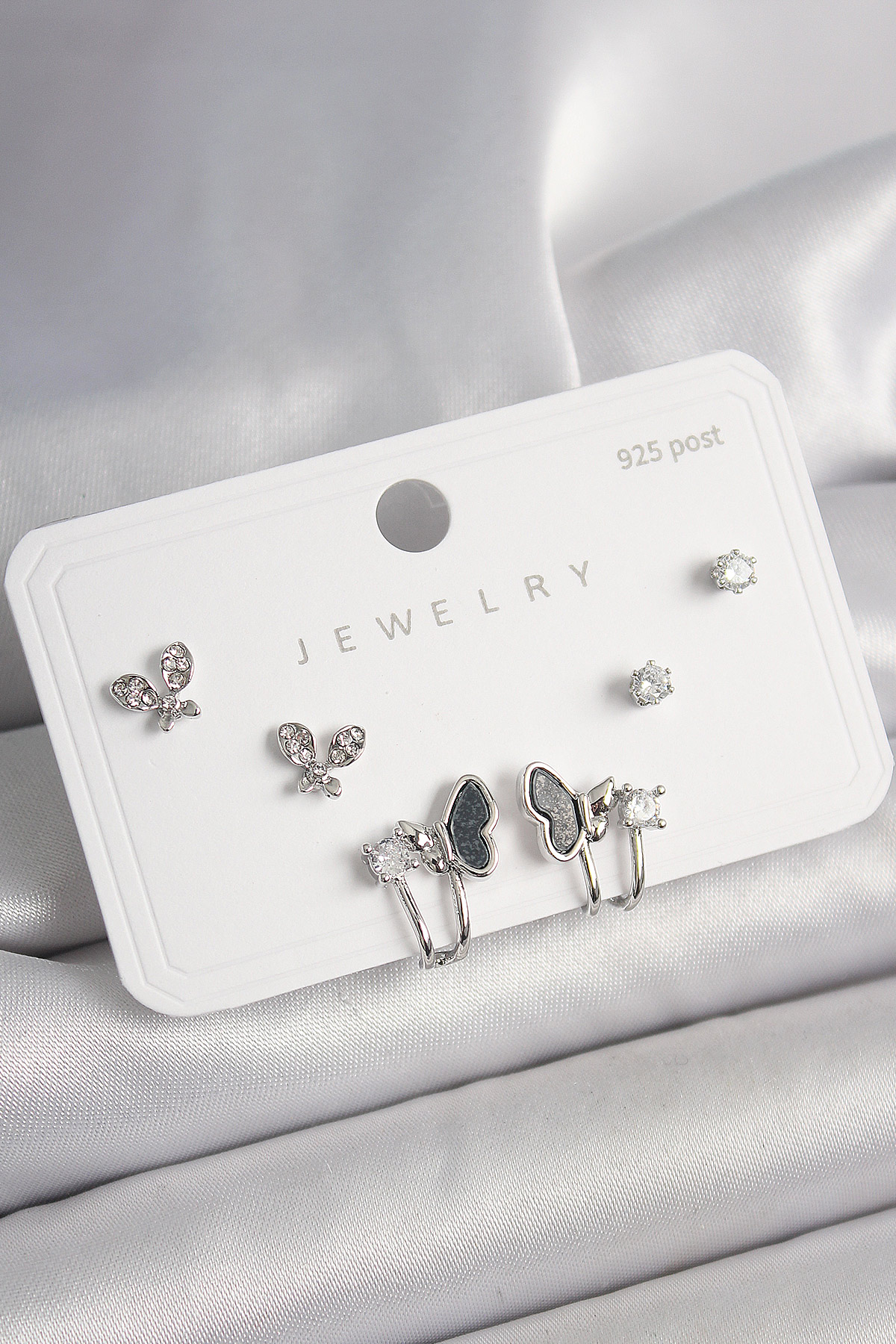 925 Ayar Gümüş Çivi Pirinç Gümüş Renk Zirkon Taşlı Kelebek Model Kadın Küpe Seti