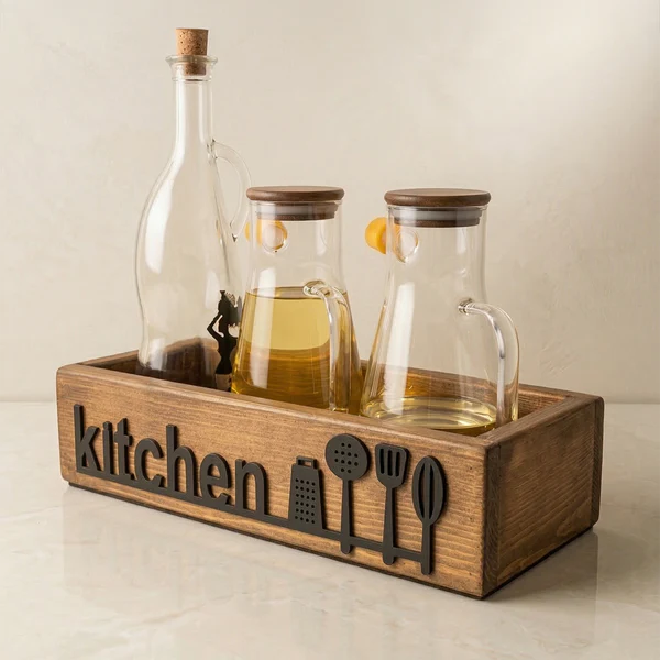 ahşap mutfak organizeri, yağdanlık standı, mutfak düzenleyici, kitchen yazılı organizer, şişe düzenleyici stand, zeytinyağı standı, sirke standı, tezgah üstü organizer, mutfak aksesuarları, ahşap mutfak ürünü, dekoratif mutfak organizeri, kafe restoran sunum ürünü, mutfak düzenleme ürünleri