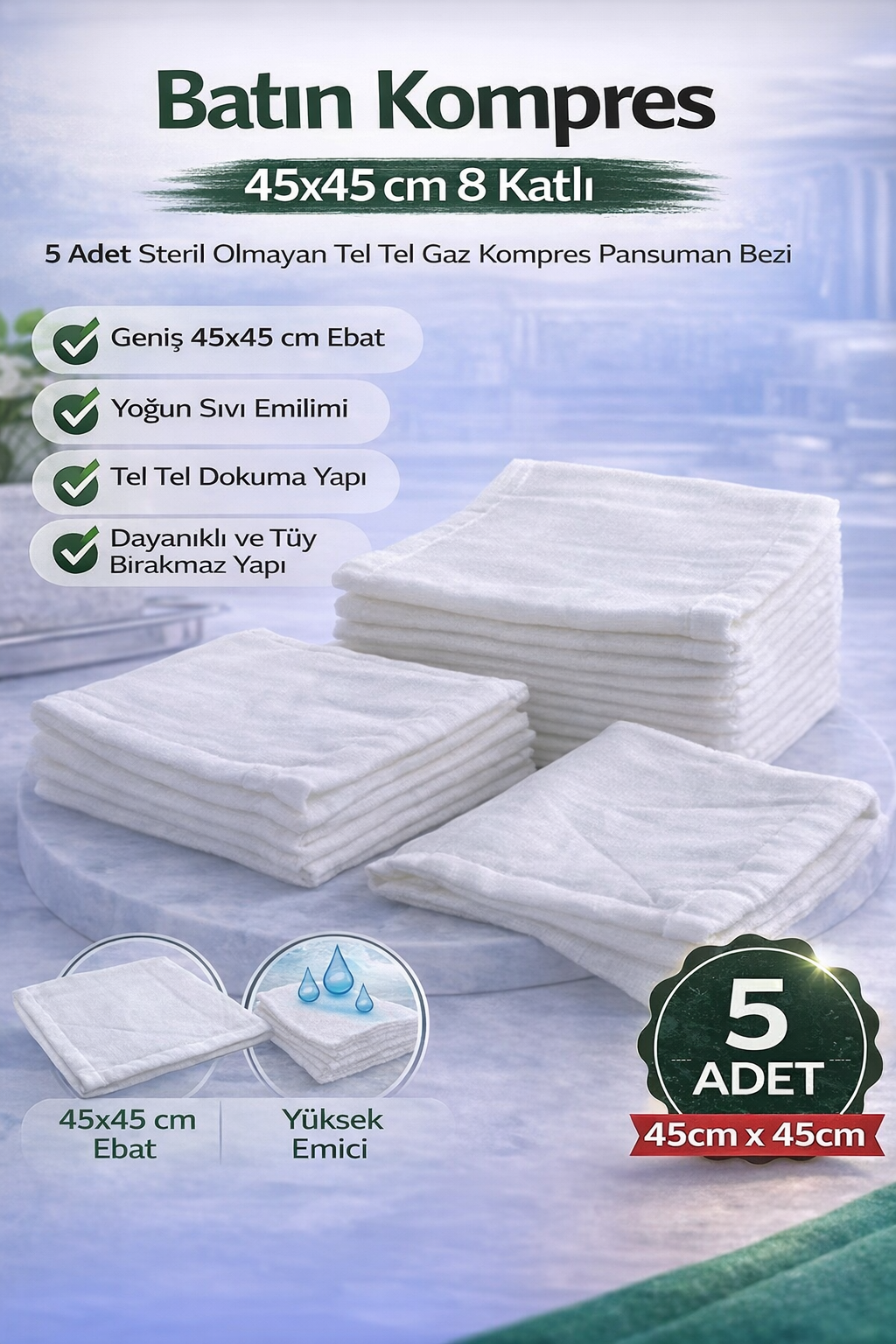 batın kompres, 45x45 gaz kompres, tel tel kompres, büyük boy gazlı bez, 8 katlı kompres, medikal pansuman bezi, ameliyat kompresi, steril olmayan kompres, yara kapatma bezi, cerrahi kompres, 5 adet batın kompres