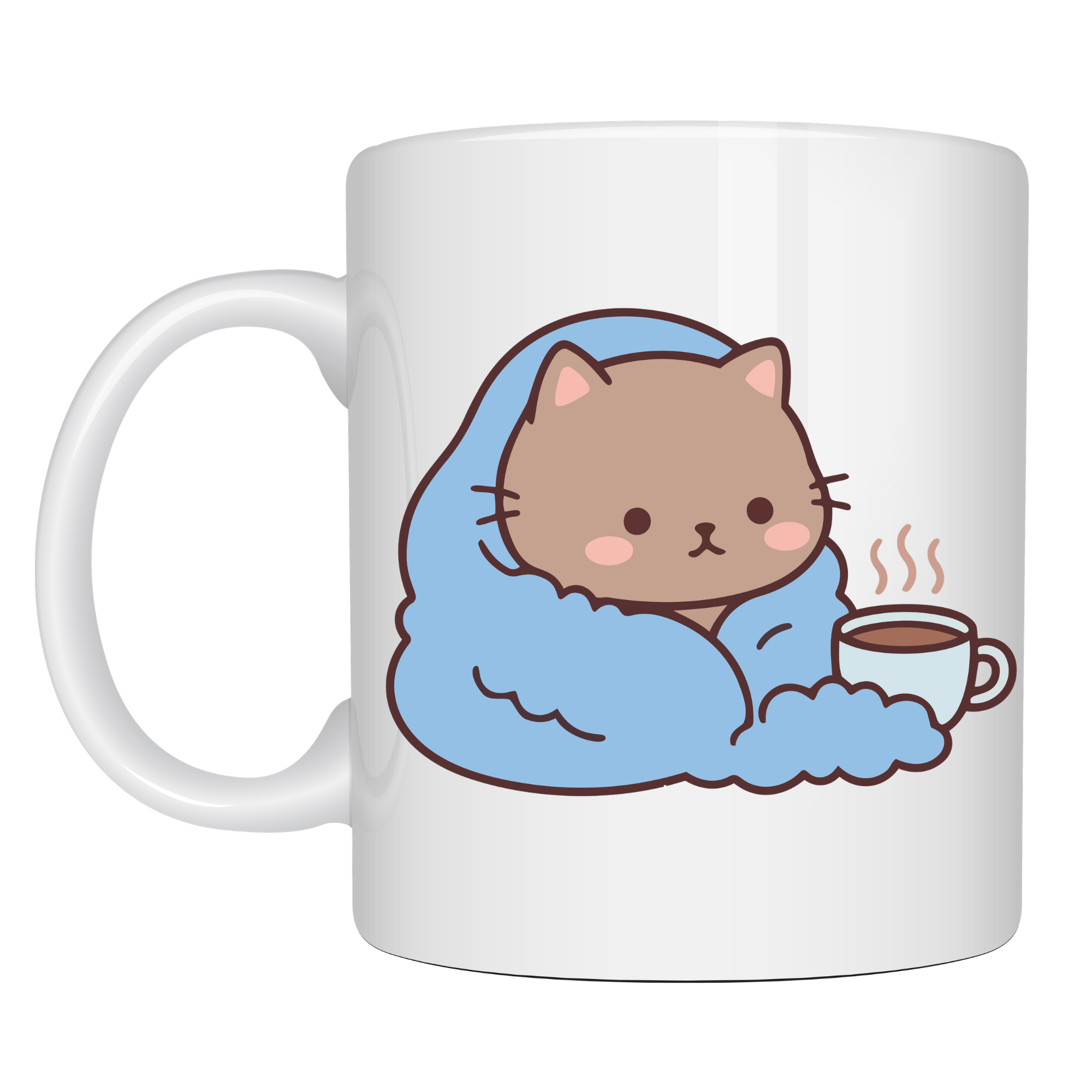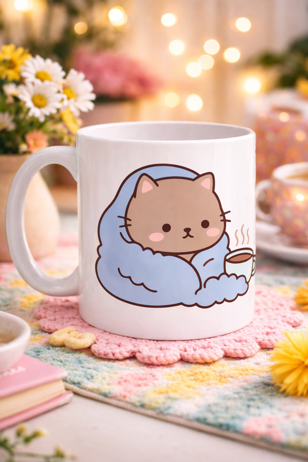 Bu sevimli porselen kupanın üzerinde yer alan tatlı kedi, tam da bu hissi anlatıyor. Mavi battaniyesine sarılmış halde sıcak kahvesini yudumlayan bu minik kedi, rahatlığın, huzurun ve küçük mutlulukların simgesi.