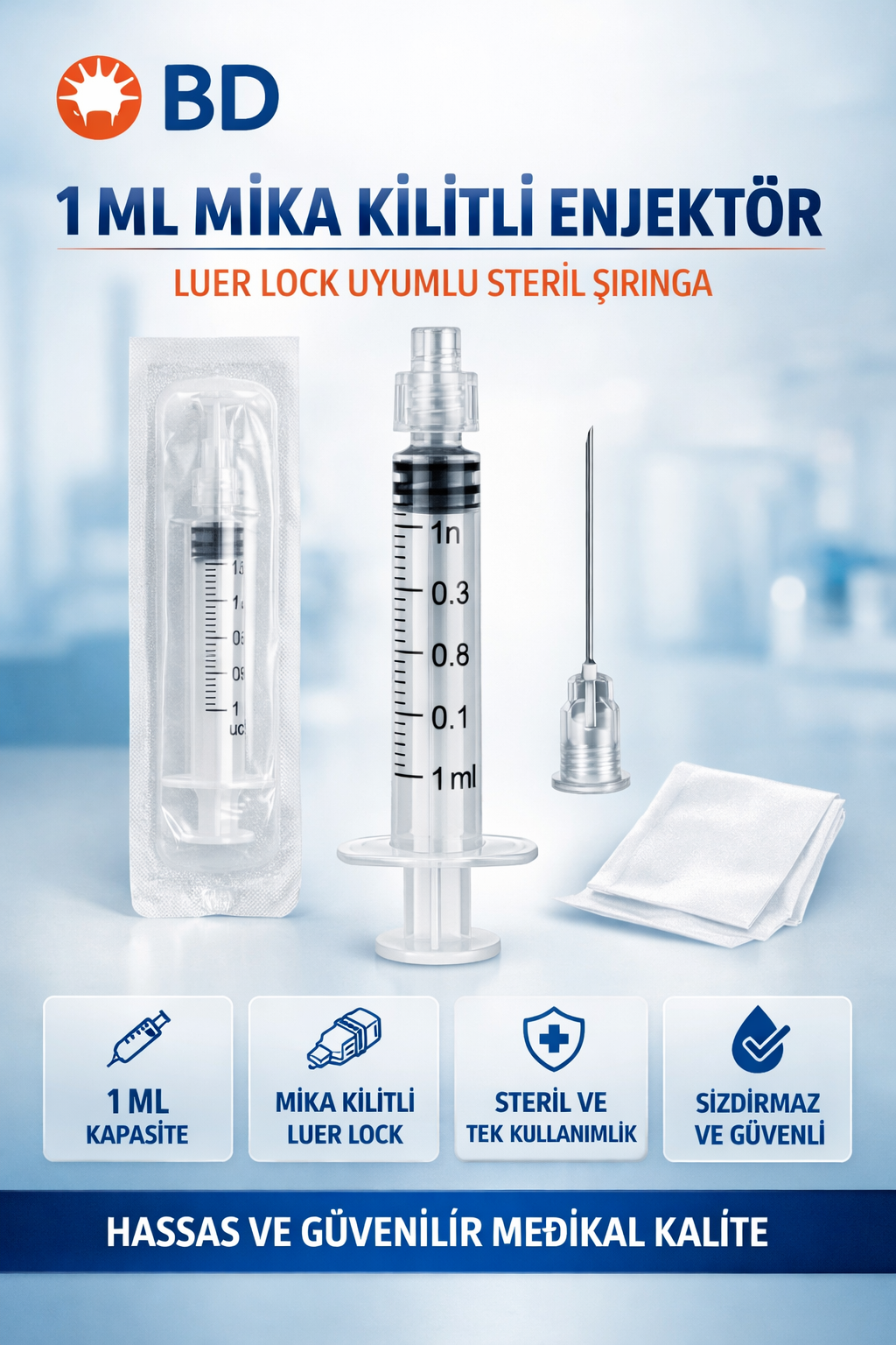 BD 1 ML Mika Kilitli Enjektör, hassas sıvı uygulamaları için özel olarak üretilmiş, güvenli ve profesyonel kullanıma uygun bir şırınga modelidir. Luer Lock (kilitli) uç sistemi sayesinde iğne bağlantısı sağlam şekilde sabitlenir ve kullanım sırasında sızdırma riskini azaltır.