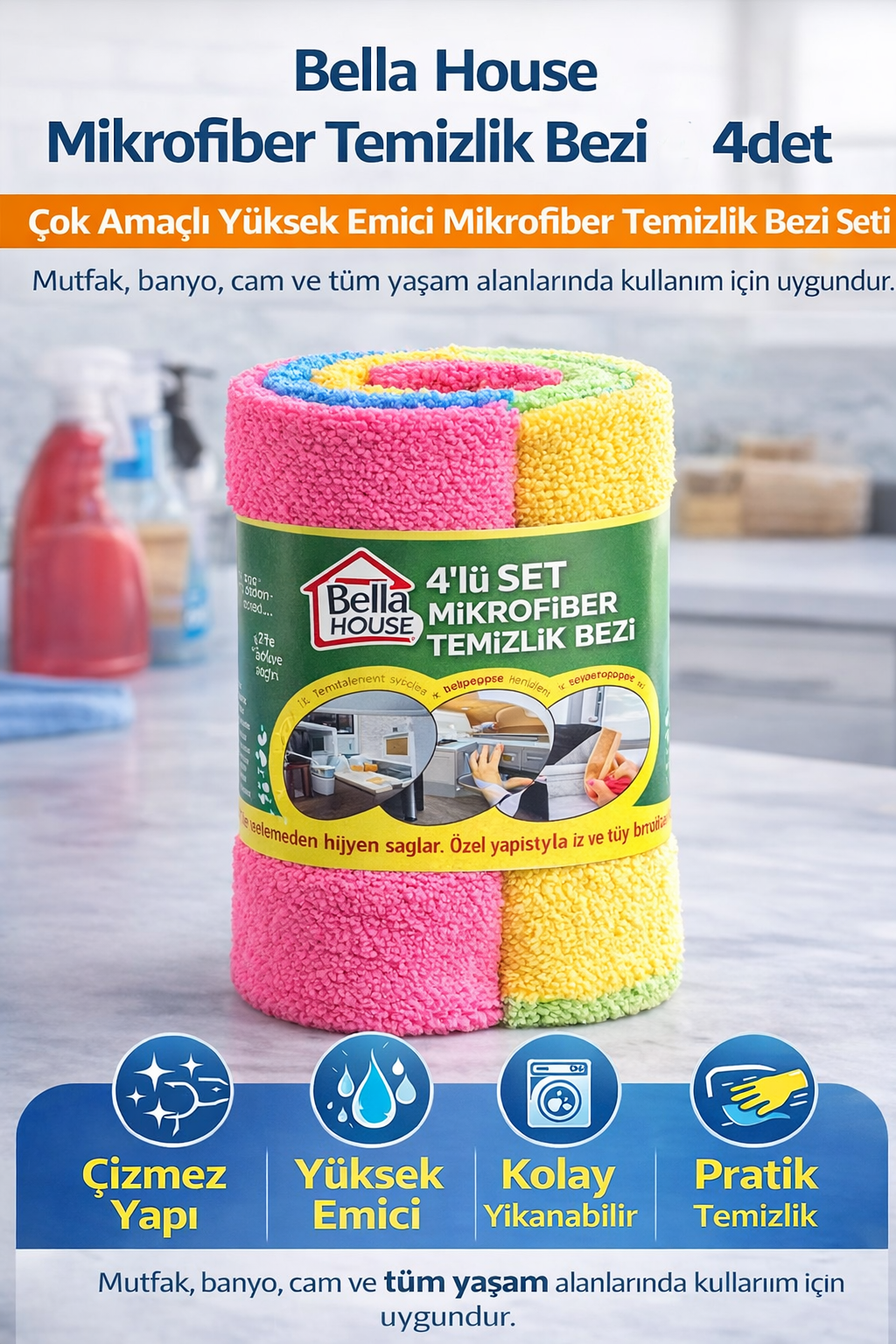 Bella House Mikrofiber Temizlik Bezi 4 Adet set, ev temizliğinde pratik ve etkili kullanım sunan çok amaçlı mikrofiber bezlerden oluşur. Yüksek emiciliğe sahip özel mikrofiber dokusu sayesinde suyu ve kiri hızlı şekilde içine hapseder, yüzeylerde iz ve tüy bırakmadan temizlik sağlar.
