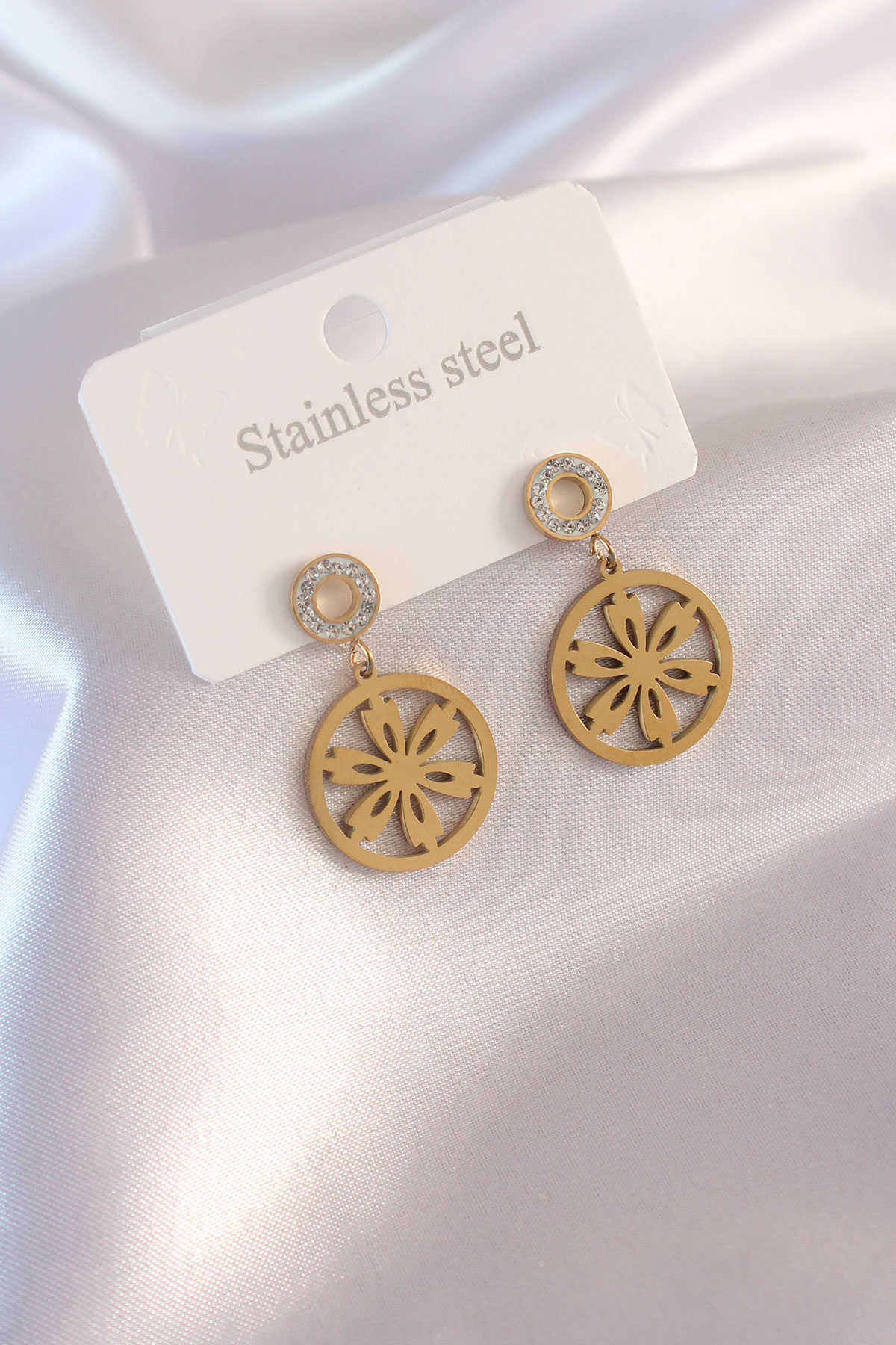 Çelik Gold Renk Çiçek Figür Zirkon Taş Detay Kadın Küpe