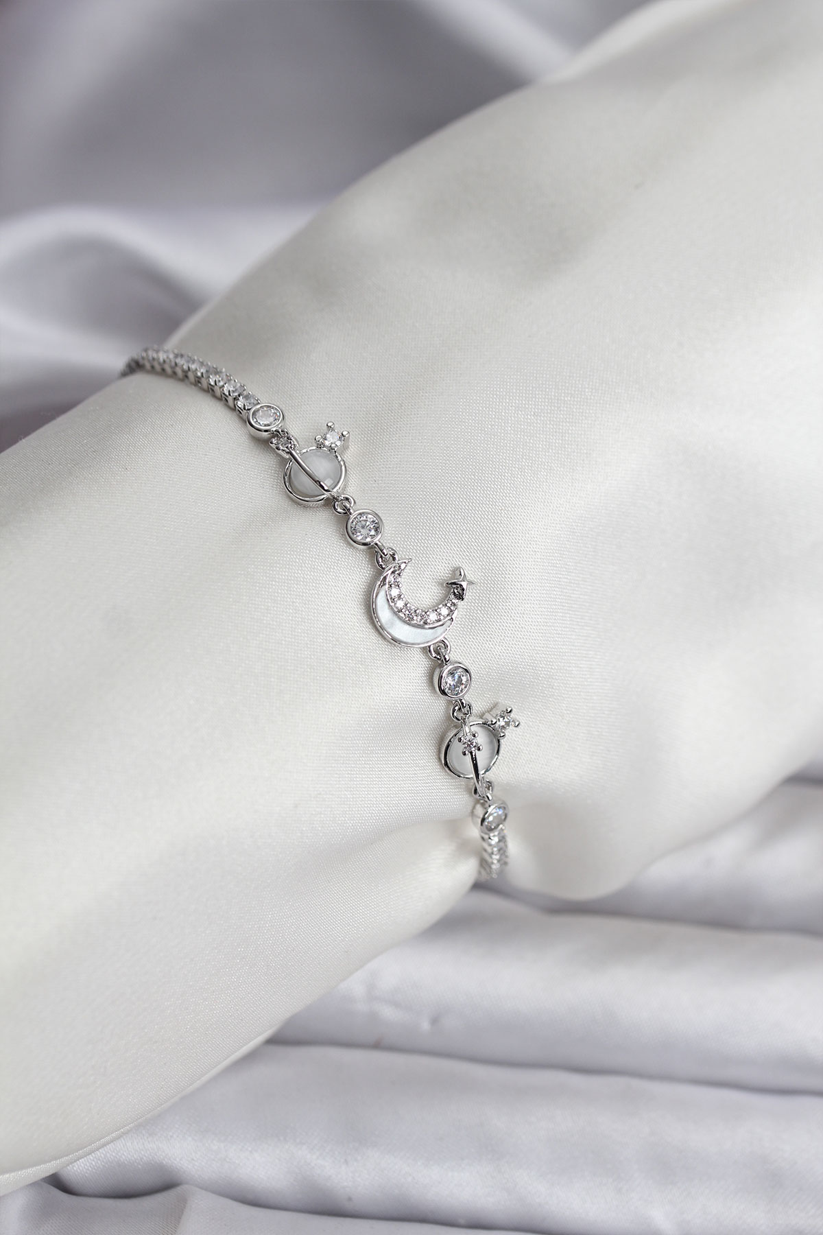 Charmlı Model Zirkon Taşlı Gümüş Renk Su Yolu Kadın Bileklik