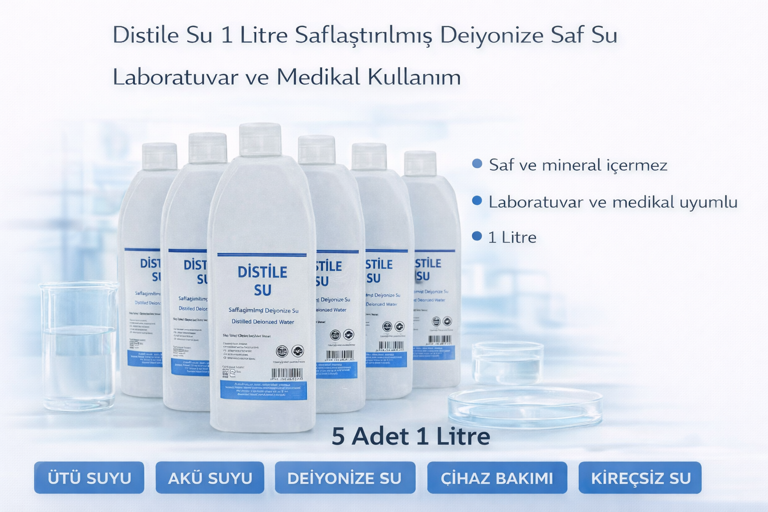 distile su, saf su 1 litre, deiyonize su, ütü suyu, akü suyu, saflaştırılmış su, laboratuvar suyu, medikal saf su, cihaz bakım suyu, kireçsiz su, distile su 5 adet