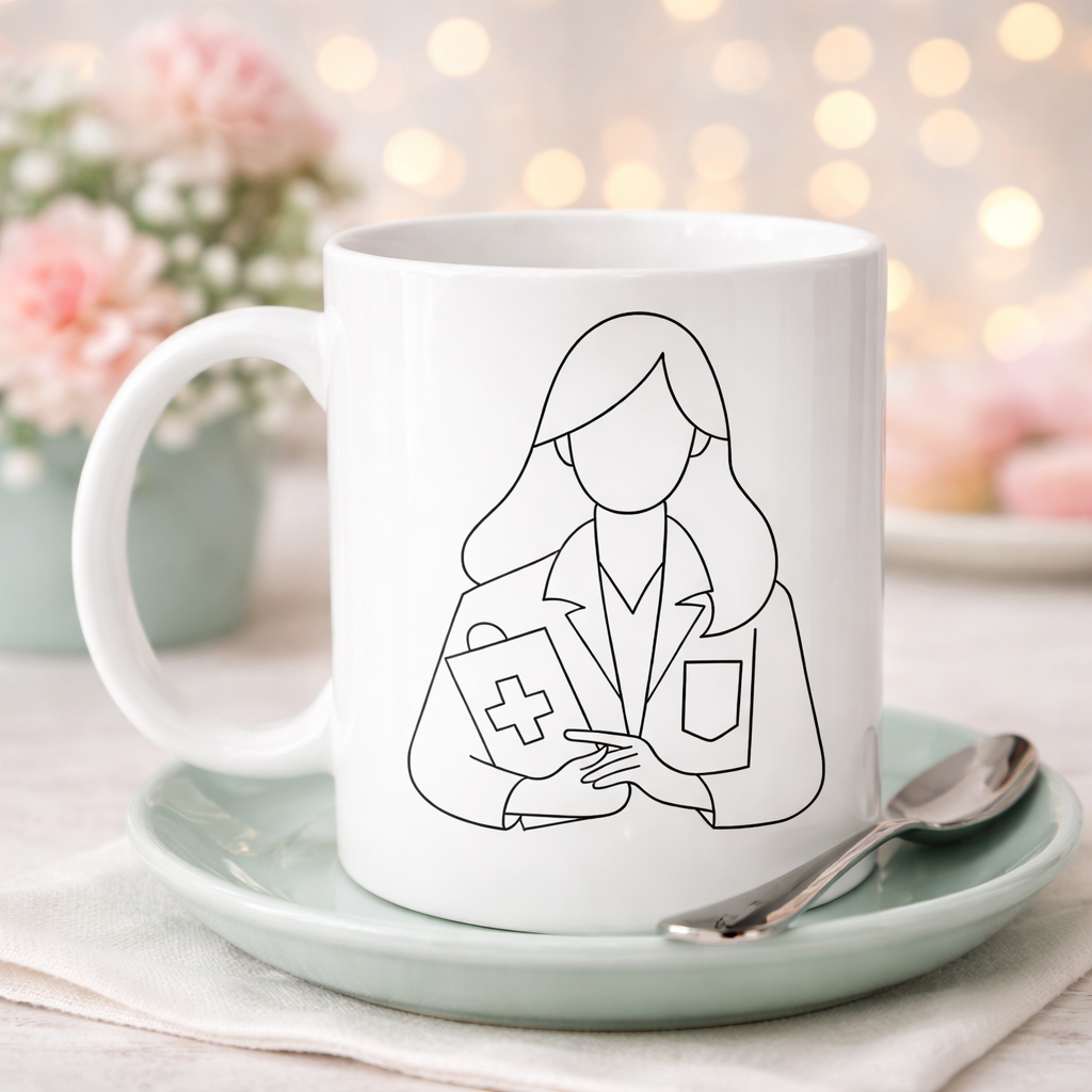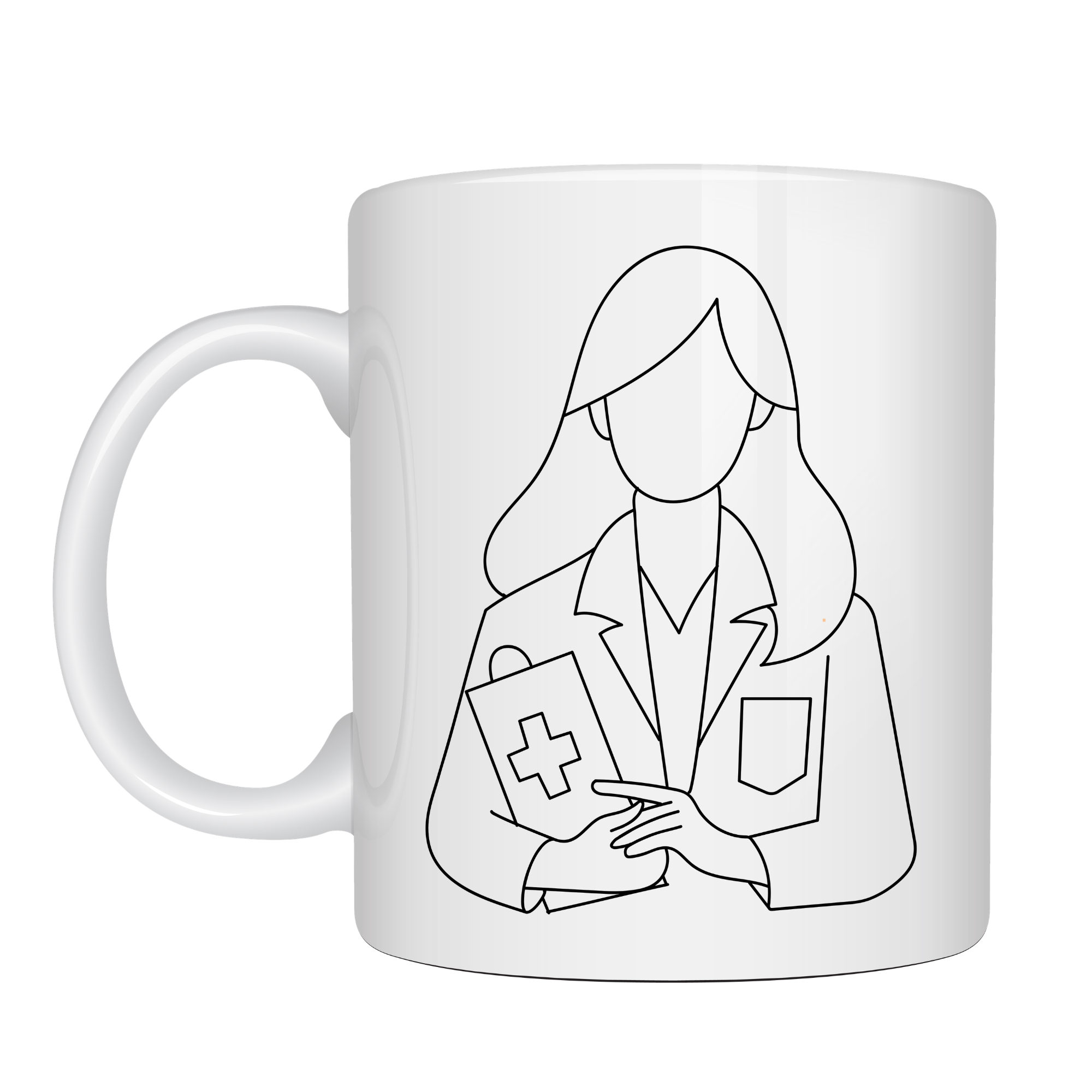 Doktor Temalı Porselen Kupa MODEL 173 – Kadın Doktor Çizimli Kahve Kupası – Sağlık Çalışanı Hediyesi – Doktorlara Özel Tasarım Kupa