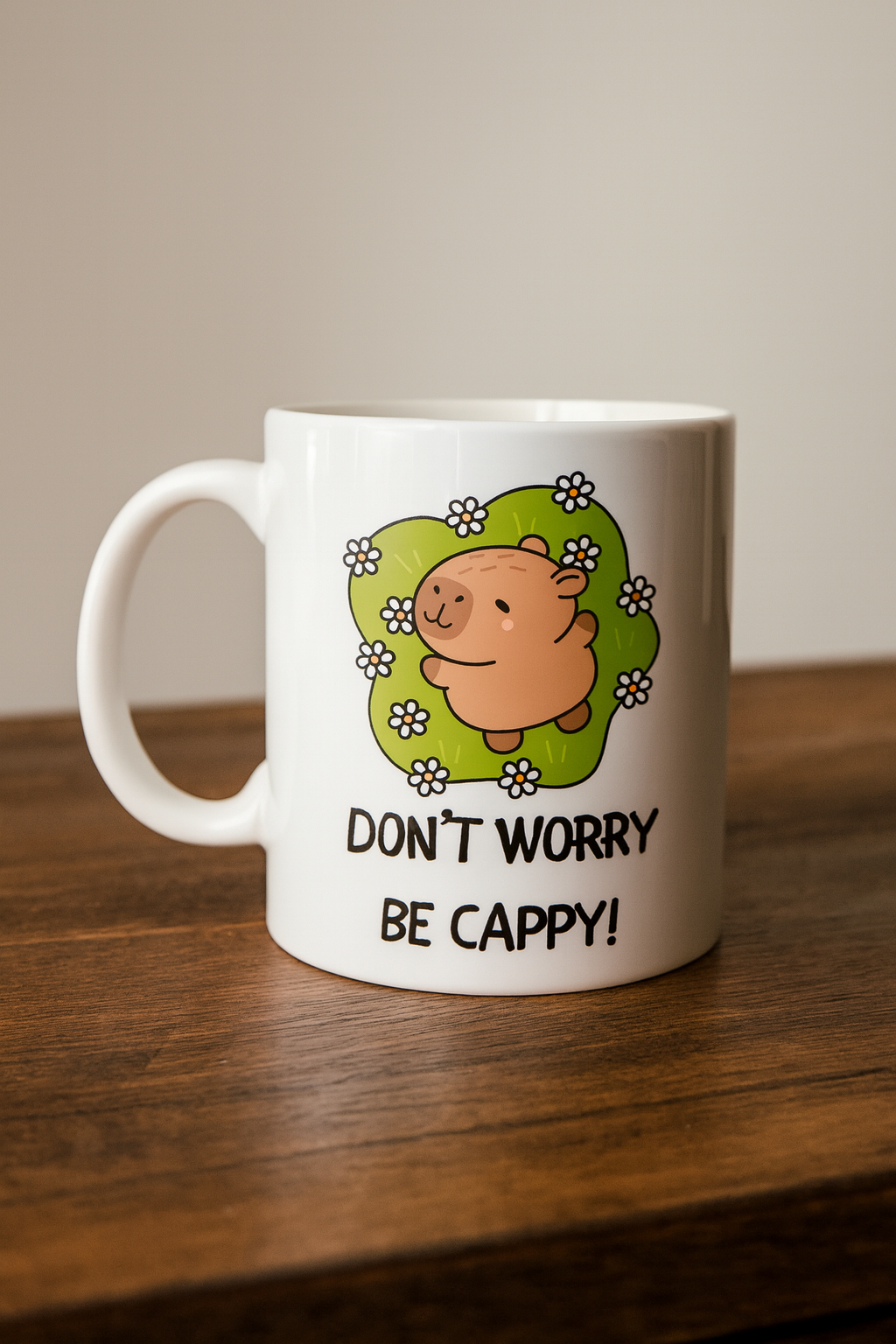 Don’t worry be cappy yazılı kapibara tasarım kupa ile gününüze neşe katın. Model 231 baskılı seramik kupa hediye ve günlük kullanım için ideal.