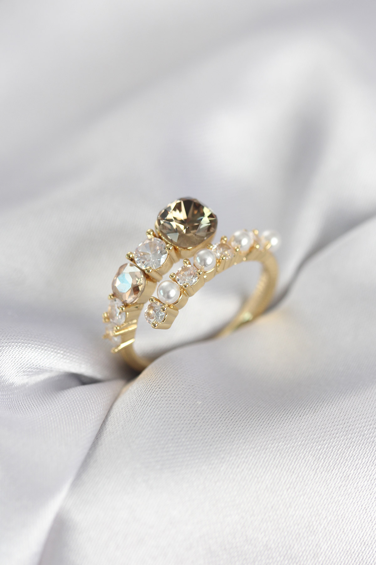 Gold Renk Pirinç Zirkon Taşlı İncili Kadın Yüzük