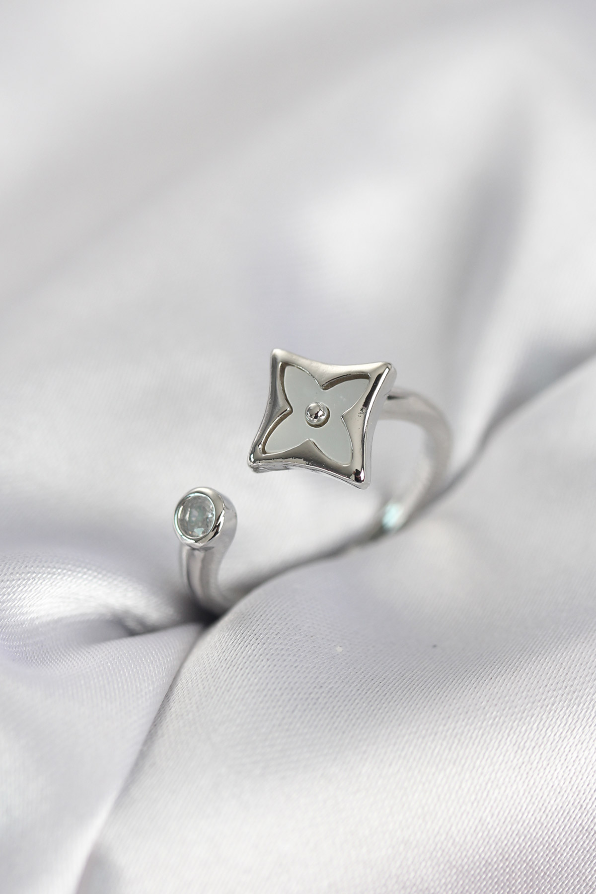 Gümüş Renk Köşeli Yonca Model Zirkon Taşlı Kadın Yüzük