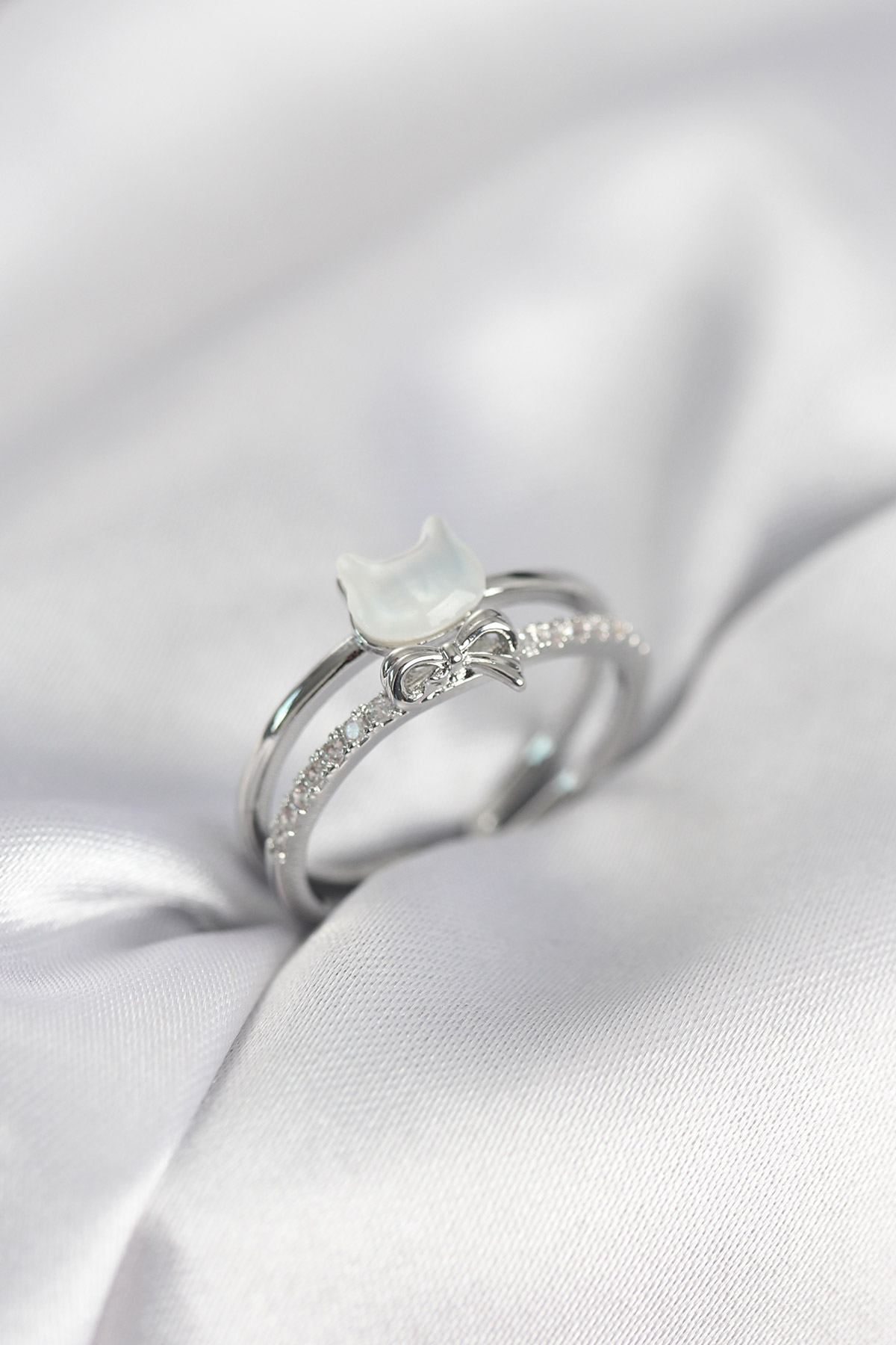 Gümüş Renk Sedefli Kedi Model Fiyonklu Zirkon Taşlı Kadın Yüzük