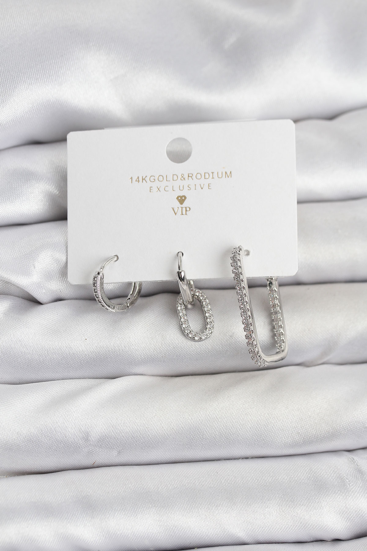 Gümüş Renk Zirkon Taşlı 3'lü Kadın Küpe Seti