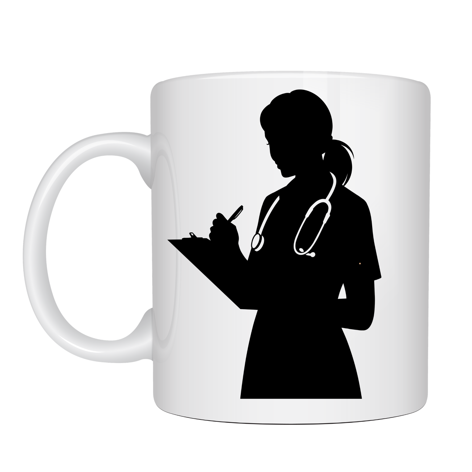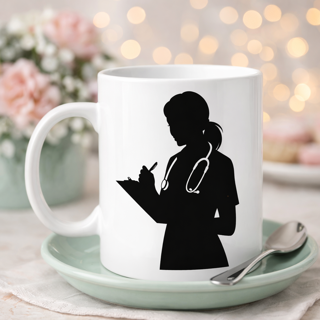 Kupada yer alan stetoskoplu kadın sağlık çalışanı silüeti, bir hemşirenin günlük hayatındaki en önemli görevlerinden birini simgeler: hastaları dinlemek, not almak ve onların iyiliği için her detayı dikkatle takip etmek. Bu güçlü ve zarif tasarım; şefkat, sorumluluk ve profesyonelliğin sembolü olarak kupaya anlam katmaktadır.