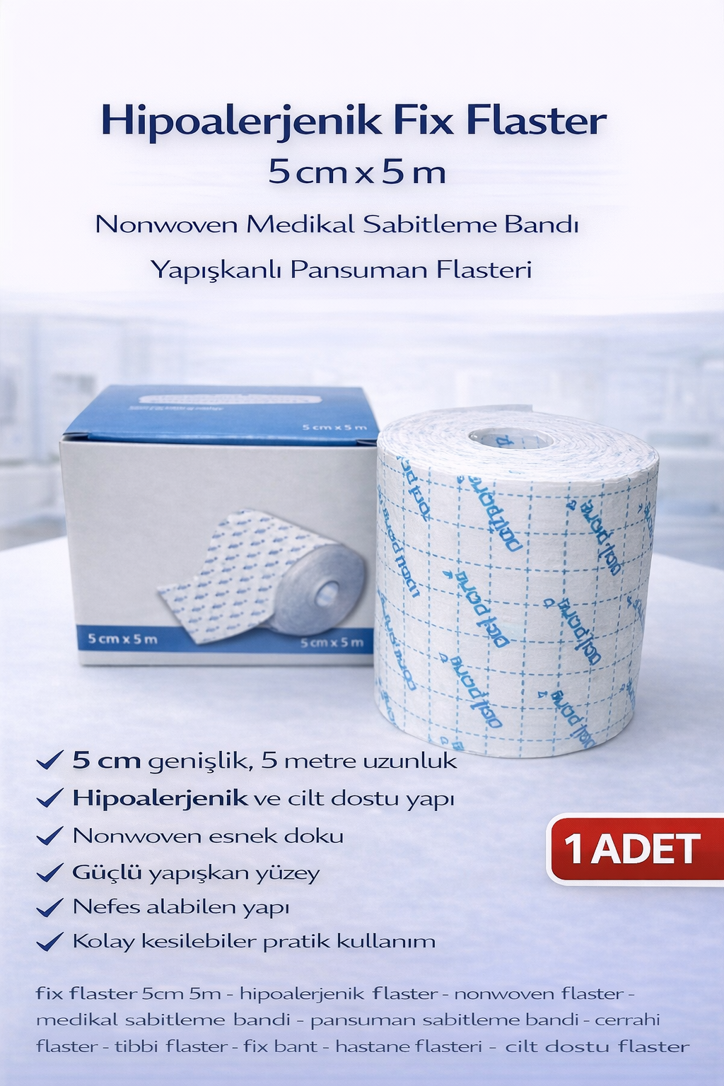 fix flaster 5cm 5m, hipoalerjenik flaster, nonwoven flaster, medikal sabitleme bandı, pansuman sabitleme bandı, cerrahi flaster, tıbbi flaster, fix bant, hastane flasteri, cilt dostu flaster