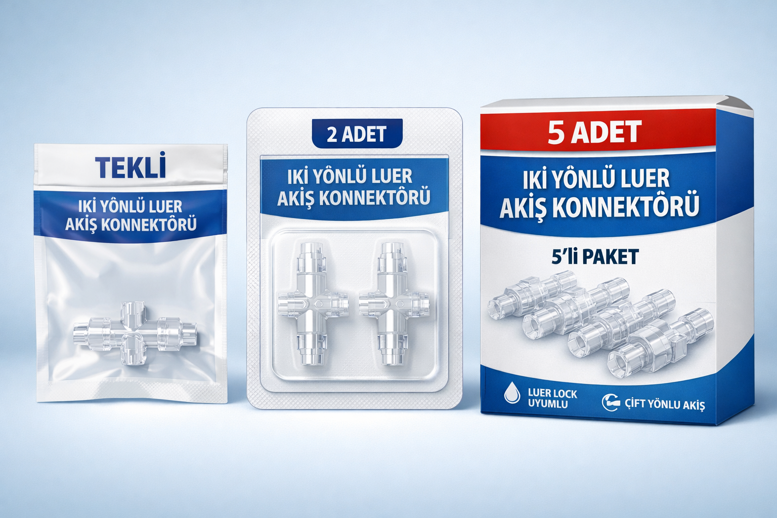 iki yönlü luer konnektör, luer akış bağlantı aparatı, medikal sıvı transfer konnektörü, çift yönlü luer connector, enjektör bağlantı aparatı, luer lock uyumlu konnektör, tekli luer konnektör, 2 adet luer konnektör, 5 adet luer konnektör, medikal bağlantı ekipmanı, hastane tipi konnektör