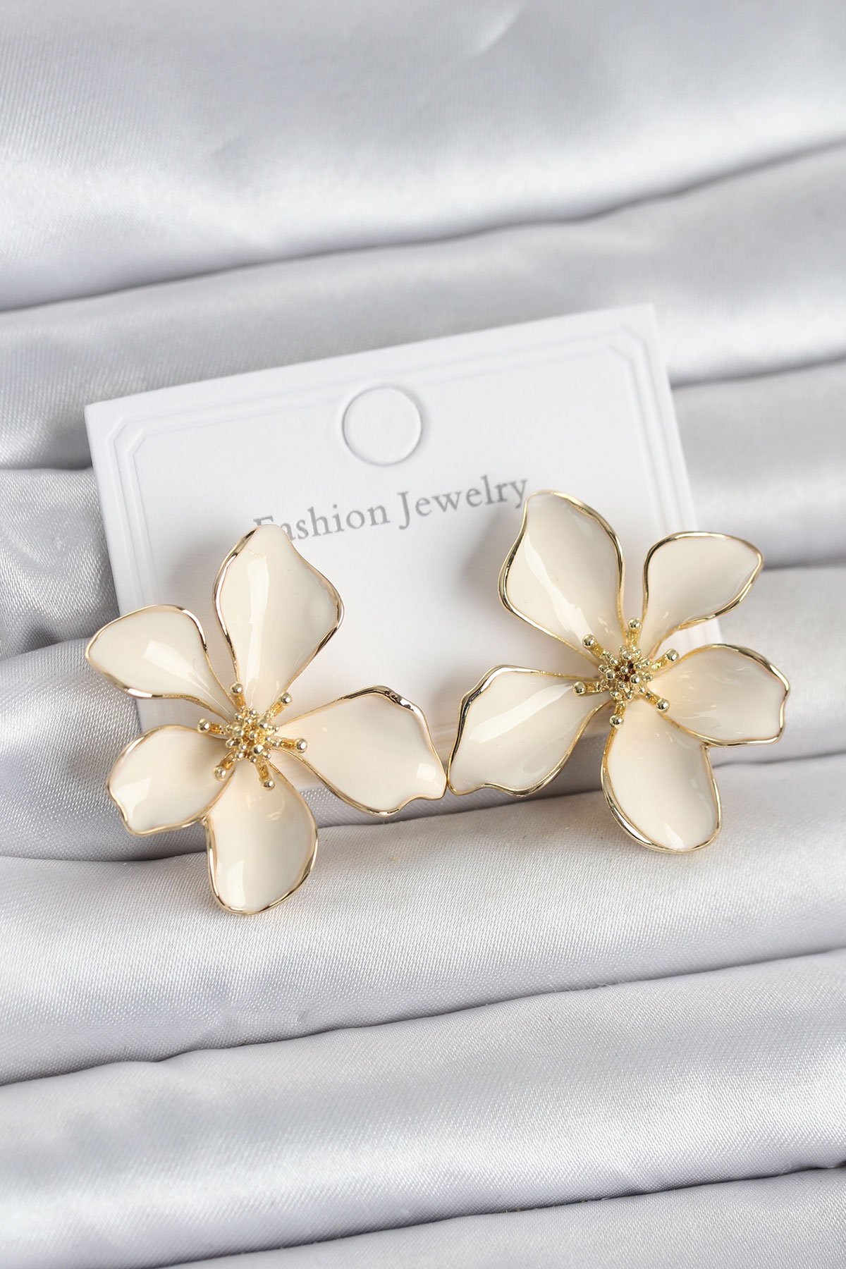 Krem Mineli Çiçek Model Pirinç Kadın Küpe