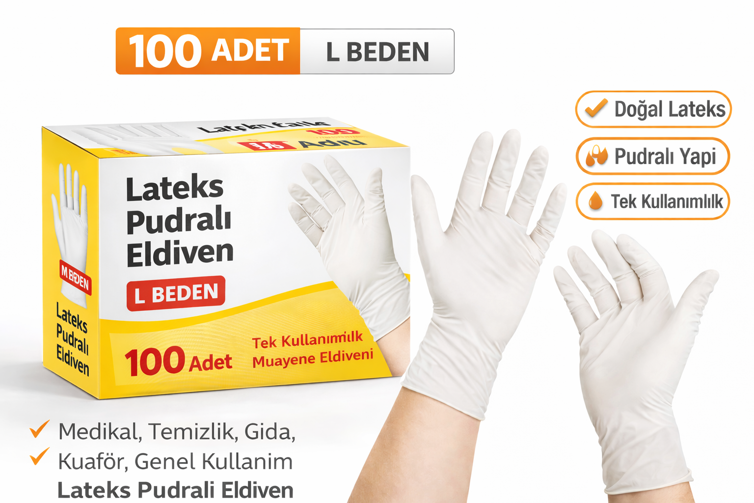 lateks pudralı eldiven, lateks eldiven l beden, pudralı eldiven 100lü, muayene eldiveni lateks, tek kullanımlık eldiven, medikal eldiven l beden, koruyucu eldiven lateks, hijyen eldiveni, lateks eldiven 100 adet, pudralı muayene eldiveni, temizlik eldiveni tek kullanımlık, gıda uyumlu lateks eldiven, büyük beden eldiven, lateks eldiven kutu, ekonomik eldiven