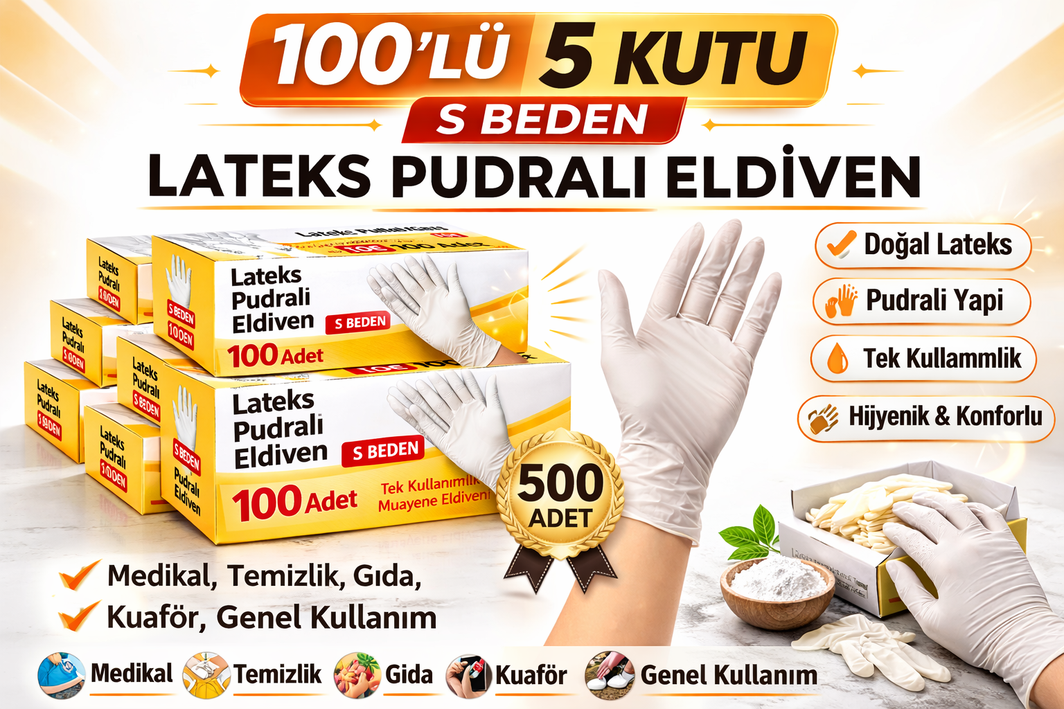 lateks pudralı eldiven, lateks eldiven s beden, pudralı eldiven 500 adet, 100lü 5 kutu eldiven, muayene eldiveni lateks, tek kullanımlık eldiven, medikal eldiven s beden, lateks eldiven toplu satış, hijyen eldiveni, koruyucu eldiven lateks, küçük beden eldiven, pudralı muayene eldiveni, temizlik eldiveni tek kullanımlık, gıda uyumlu lateks eldiven, lateks eldiven 5 kutu, ekonomik eldiven seti