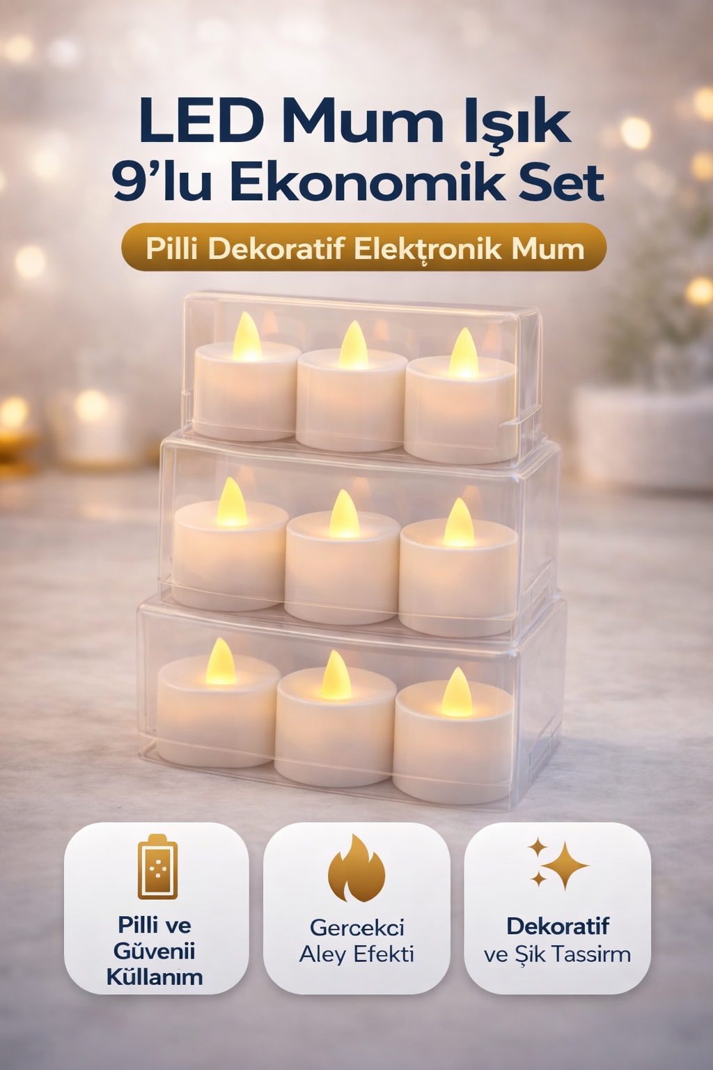 LED mum ışık 3’lü set, gerçek mum görünümüne sahip alev efektli yapısı ile ortama sıcak ve dekoratif bir ambiyans kazandırır. Pilli kullanım özelliği sayesinde kablo gerektirmez ve güvenli kullanım sunar.