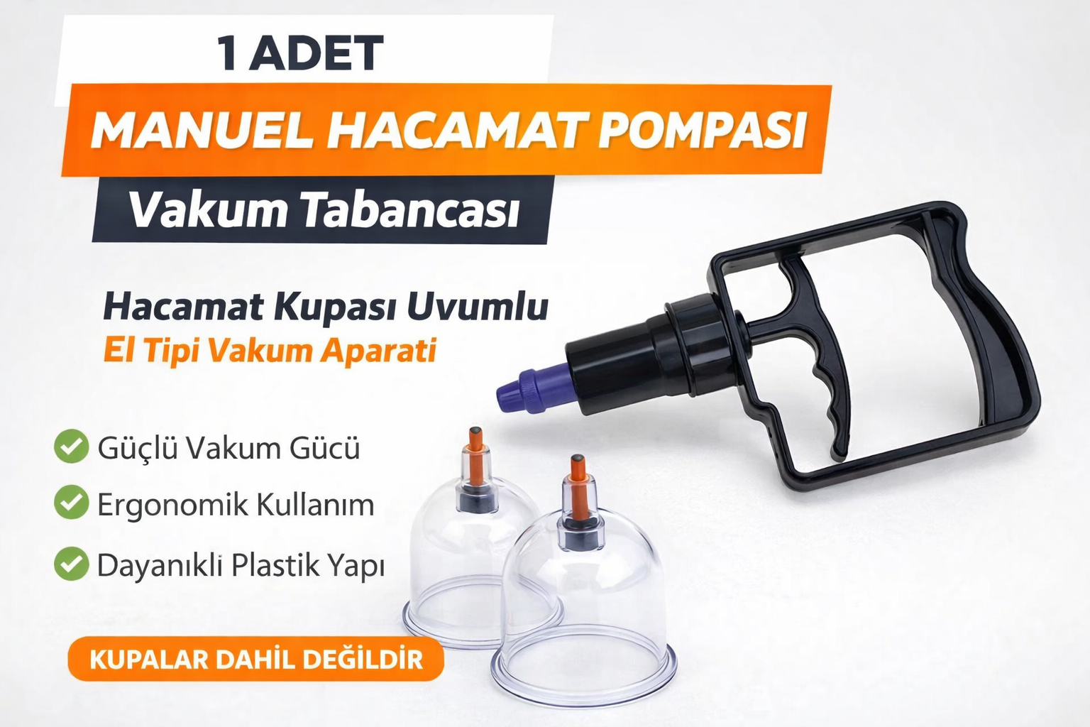 1 adet manuel hacamat pompası, hacamat kupaları ile birlikte kullanılan pratik ve dayanıklı bir vakum aparatıdır. Ergonomik tutma sapı sayesinde kolay kullanım sağlar ve kupa içerisindeki havayı kontrollü şekilde çekerek vakum oluşturulmasına yardımcı olur.