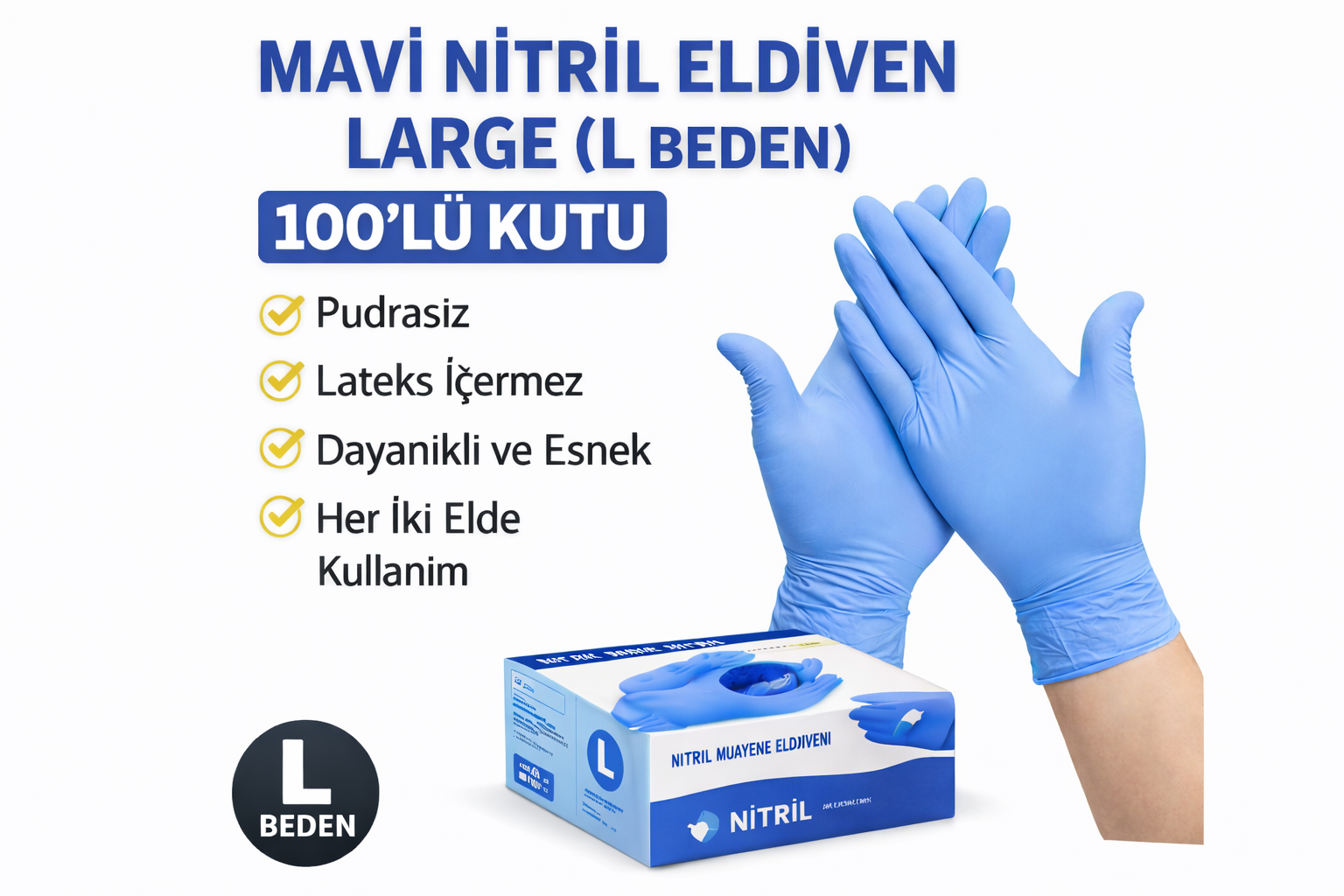 Kutu içerisinde 100 adet Large (L) beden mavi nitril eldiven bulunmaktadır. Sağlık, temizlik, gıda, güzellik ve endüstriyel kullanım için uygundur.