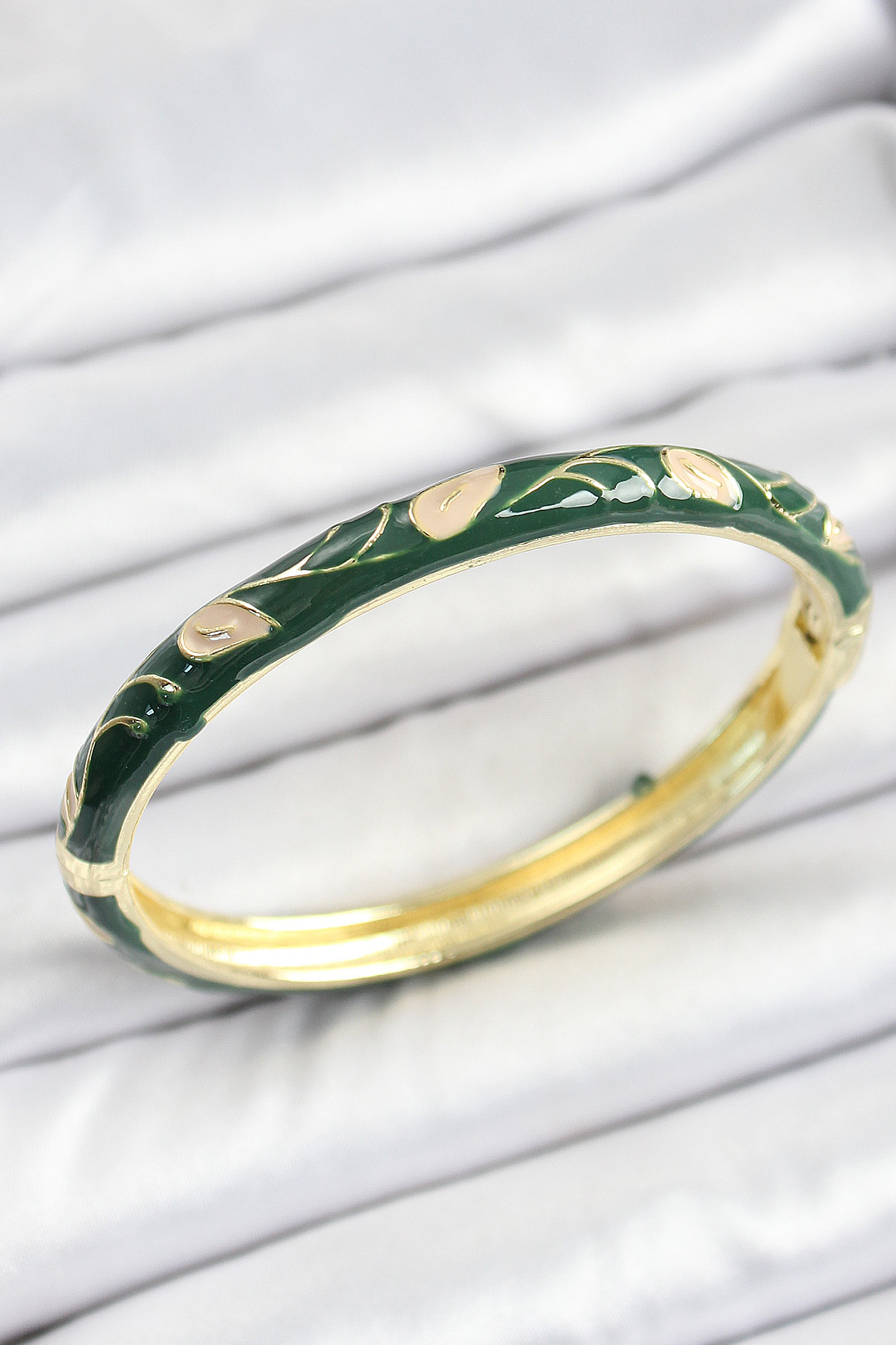 Mineli Pirinç Gold Renk Yeşil Çiçek Motifli Kadın Kelepçe