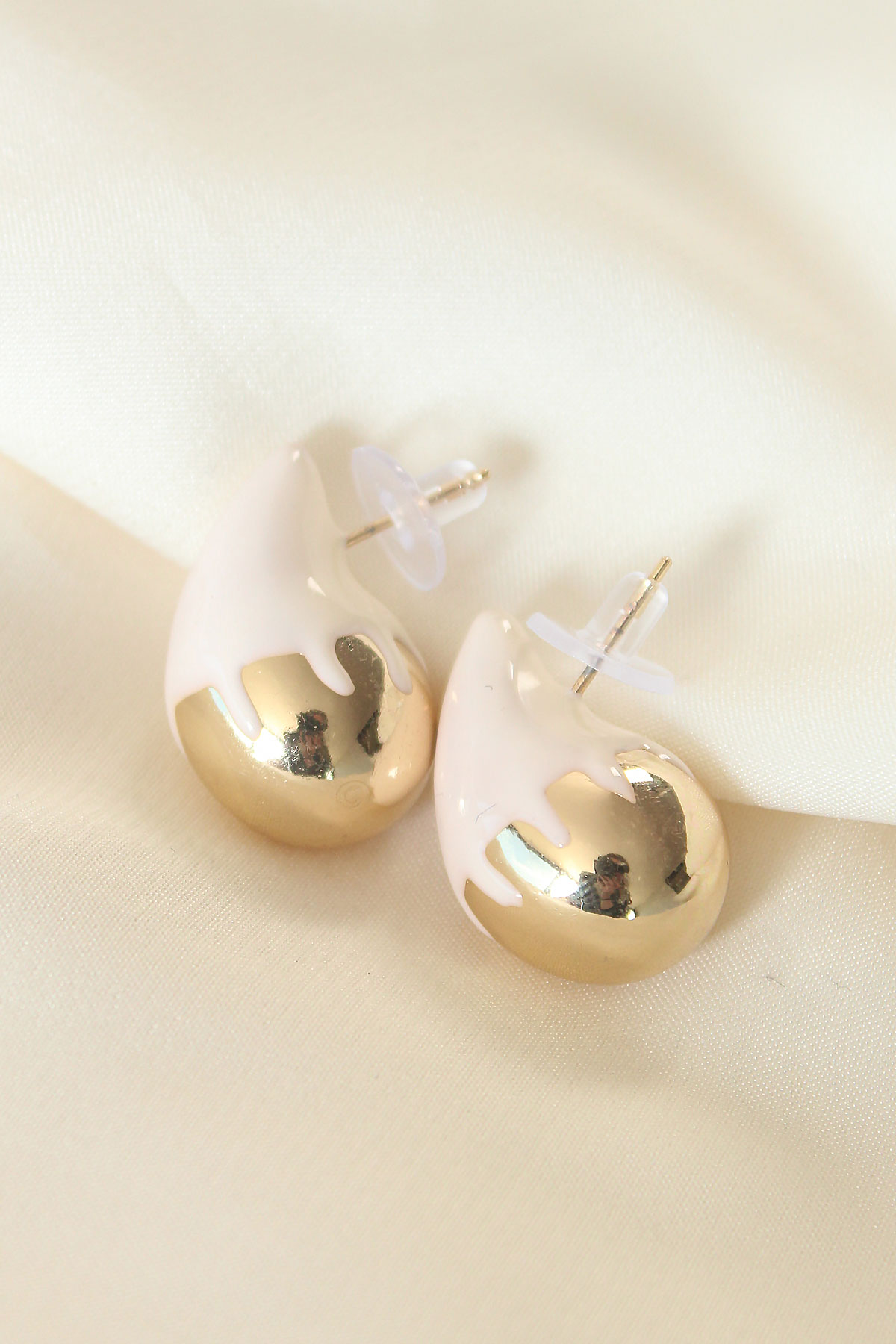 Minimal Beyaz Mineli Çift Renk Damla Küpe