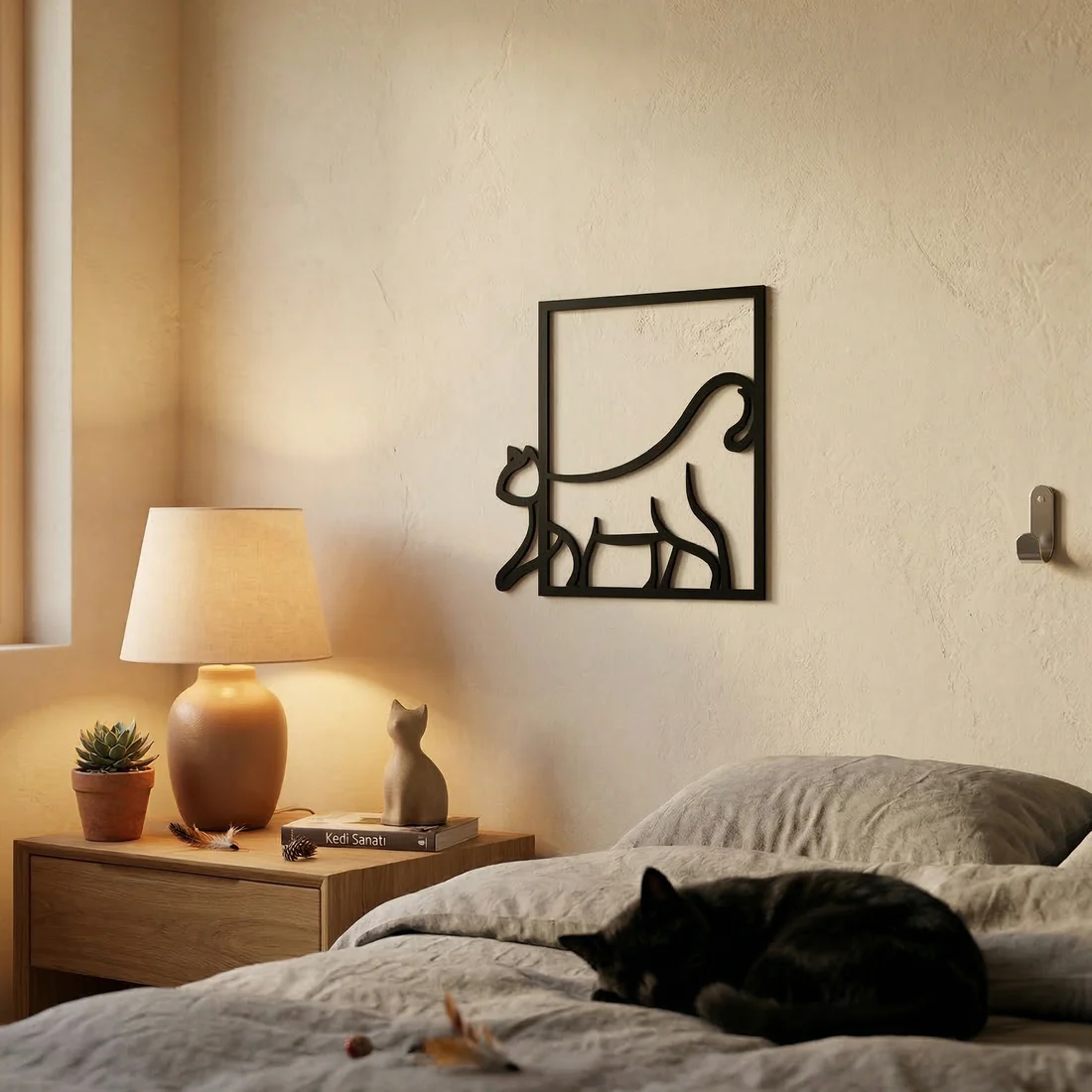 Minimal ve modern tasarımı sayesinde yatak odası, salon, oturma odası, çalışma alanı ve hobi odalarında rahatlıkla kullanılabilir. Kedi figürü ile dekorasyonunuza sıcak ve samimi bir hava katar.