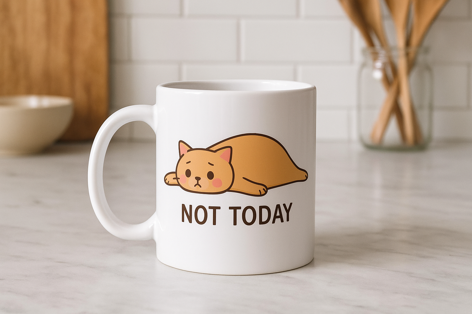 Not Today yazılı sevimli kedi tasarımlı kupa ile tarzınızı yansıtın. Model 217 baskılı seramik kupa günlük kullanım ve hediye için idealdir.