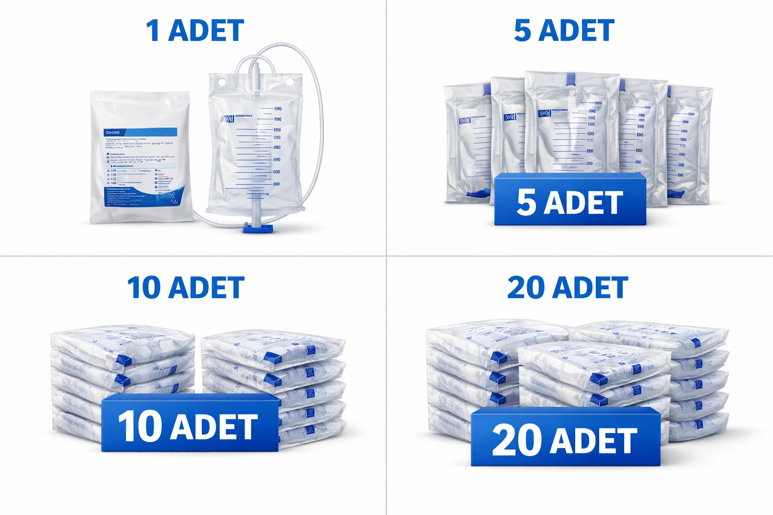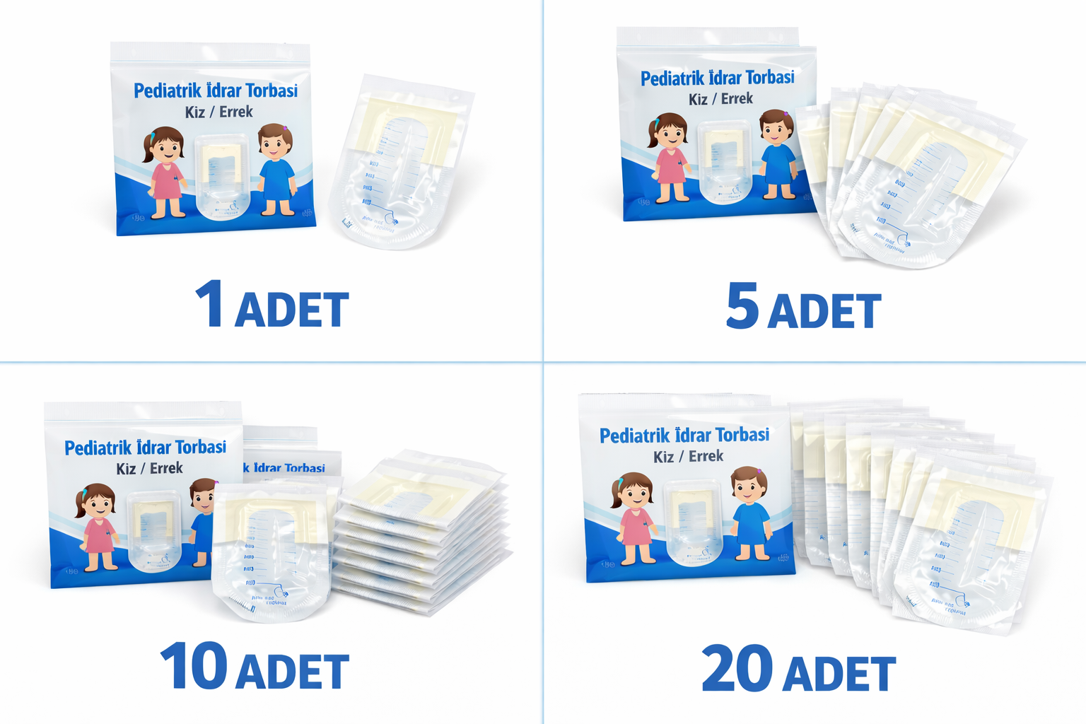 Ürün; farklı ihtiyaçlara yönelik 1 adet, 5 adet, 10 adet ve 20 adet paket seçenekleriyle sunulmaktadır. Pediatrik idrar toplama işlemlerinde pratik, hijyenik ve güvenilir bir çözümdür.
